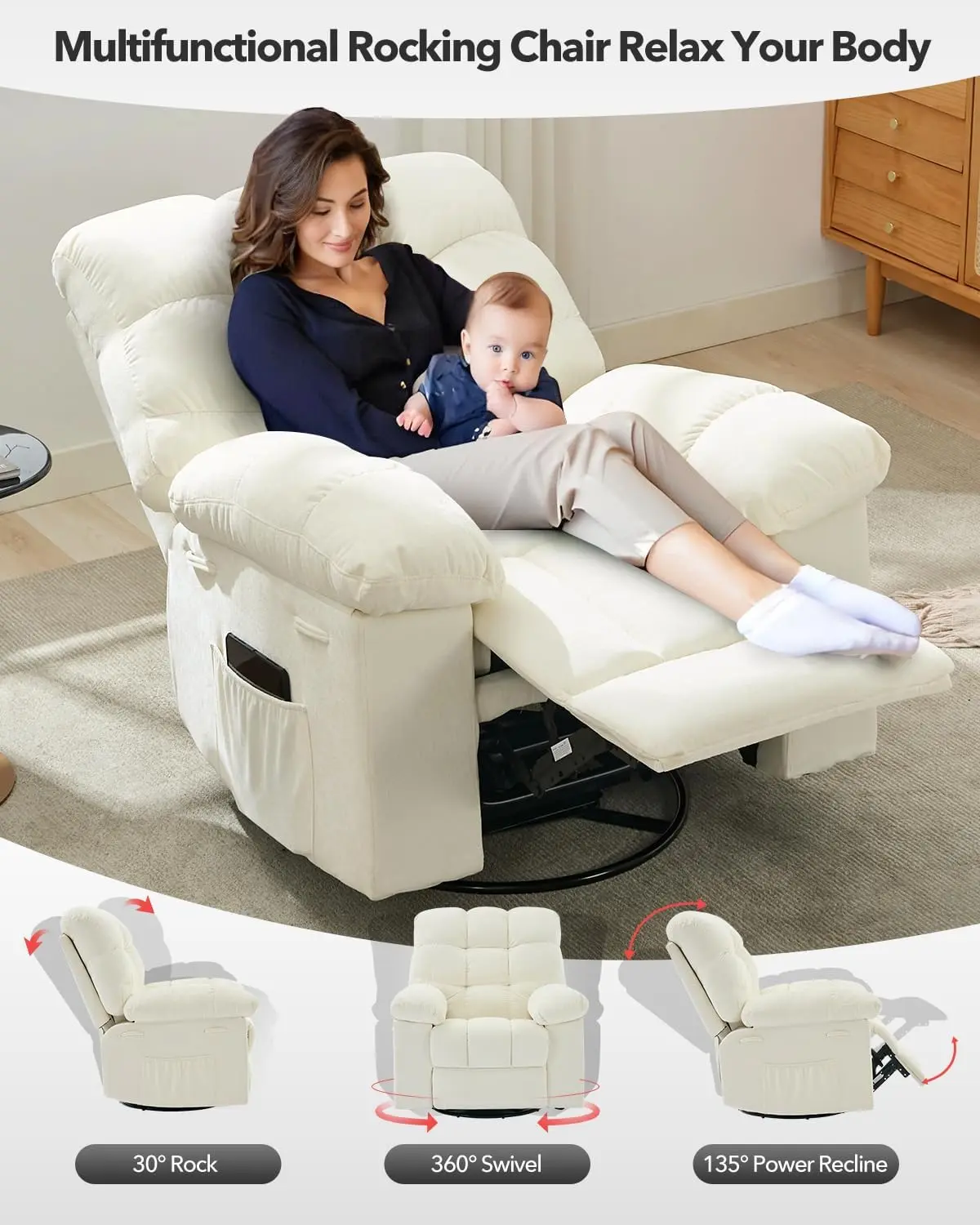 · 360° Swivel & Gentle Rocking: Experience relaxation with this swivel recliner chair, featuring 360° smooth rotation, 30° gentle rocking, and a 135° adjustable backrest. Effortlessly extend the footrest for complete comfort—perfect for nurseries, living rooms, or cozy reading corners