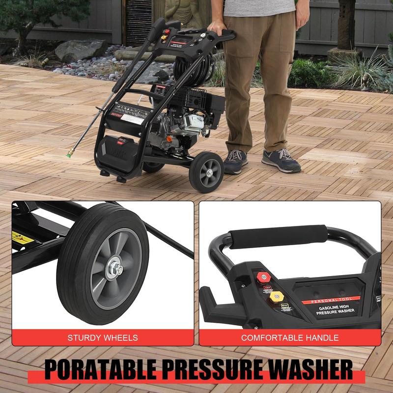 · 【EASY TO MOVE】The pressure washer is equipped with an 80-foot hose and an 18-foot straight pole to ensure freedom of movement. The design of two wheels breaks through the environmental limitations, easy to move and operate.