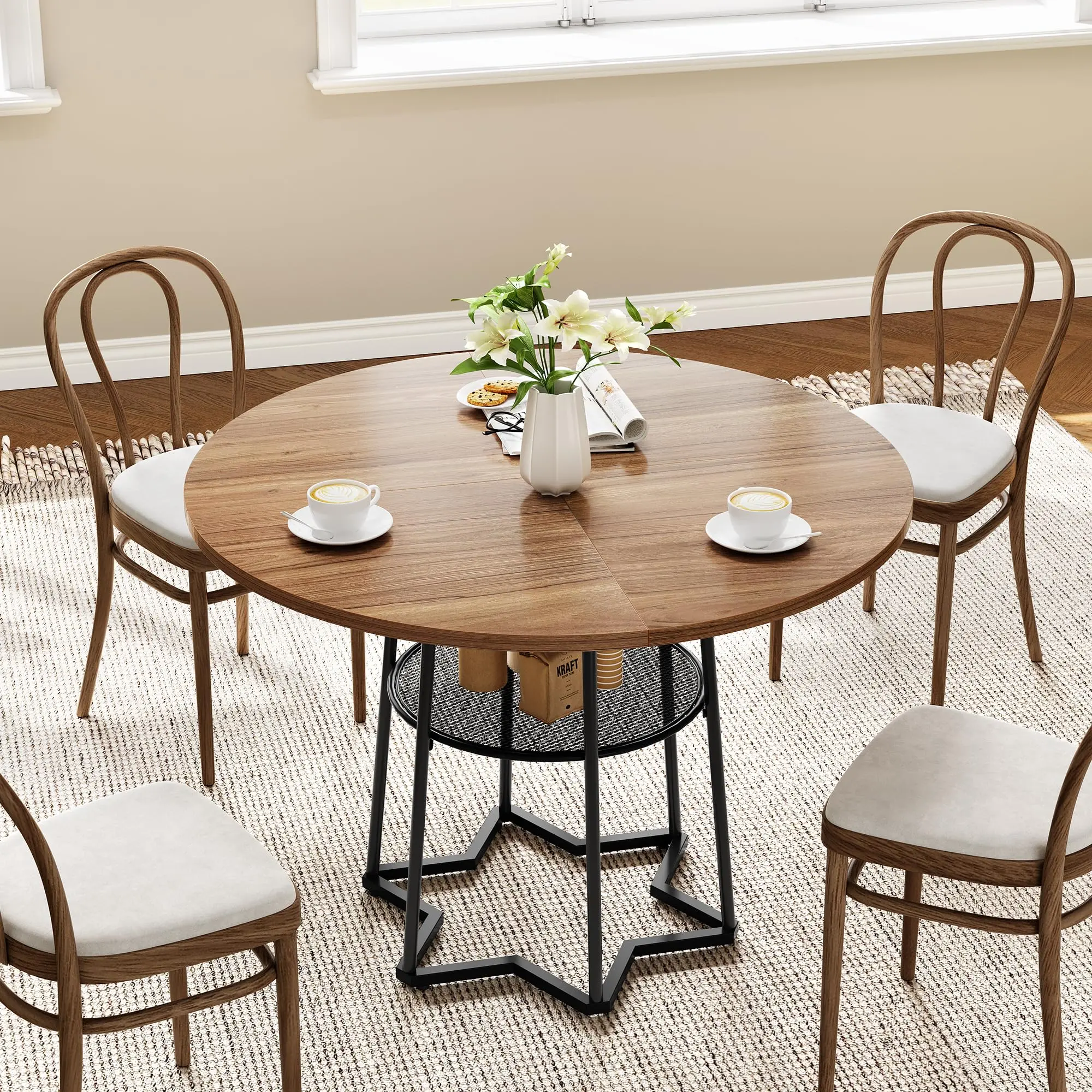 · - Modern Farmhouse Style: Searching for a round kitchen table for your home? This farmhouse round dining table features a rustic wood grain tabletop and a unique hexagram-shaped black metal base, seamlessly blending modern elegance into your dining space