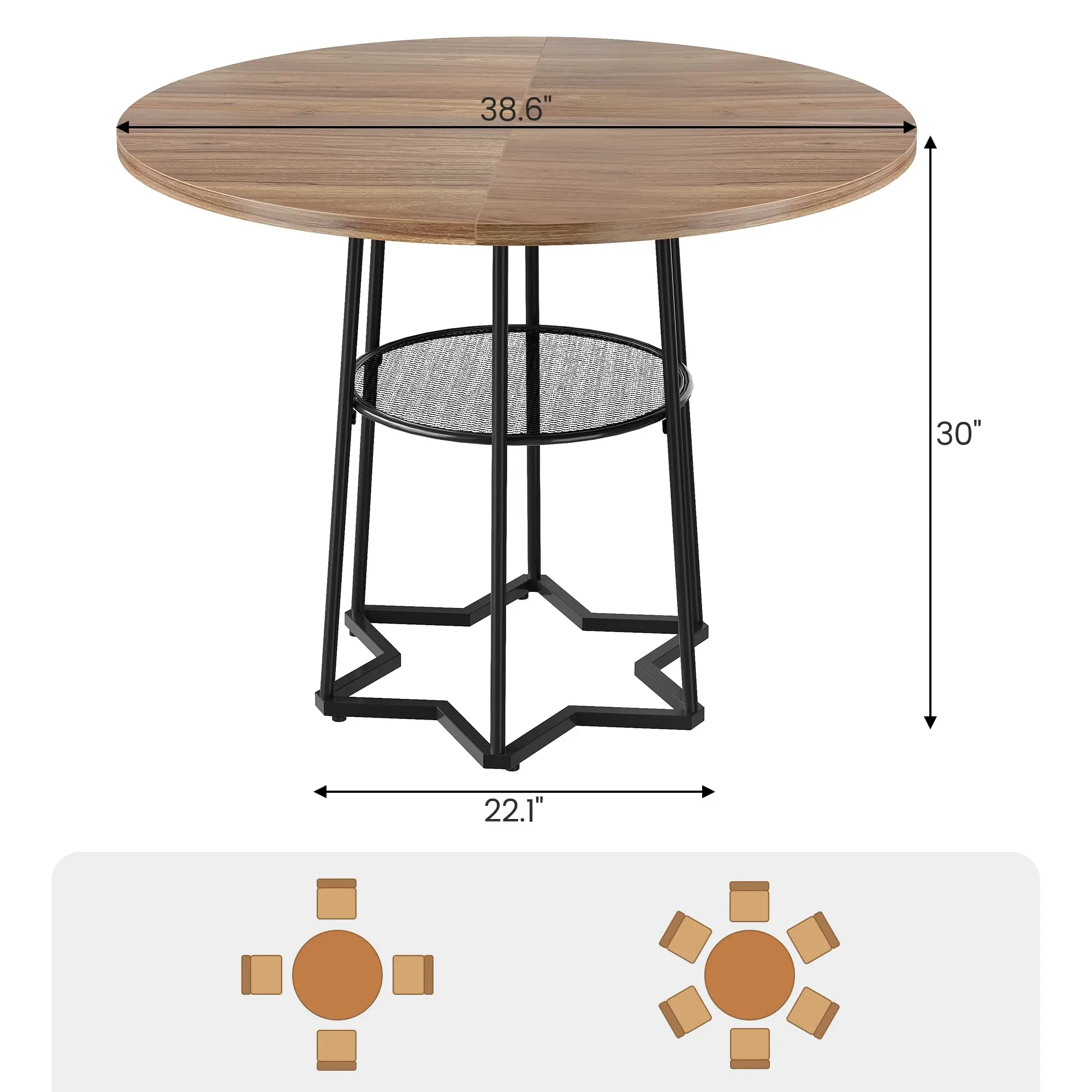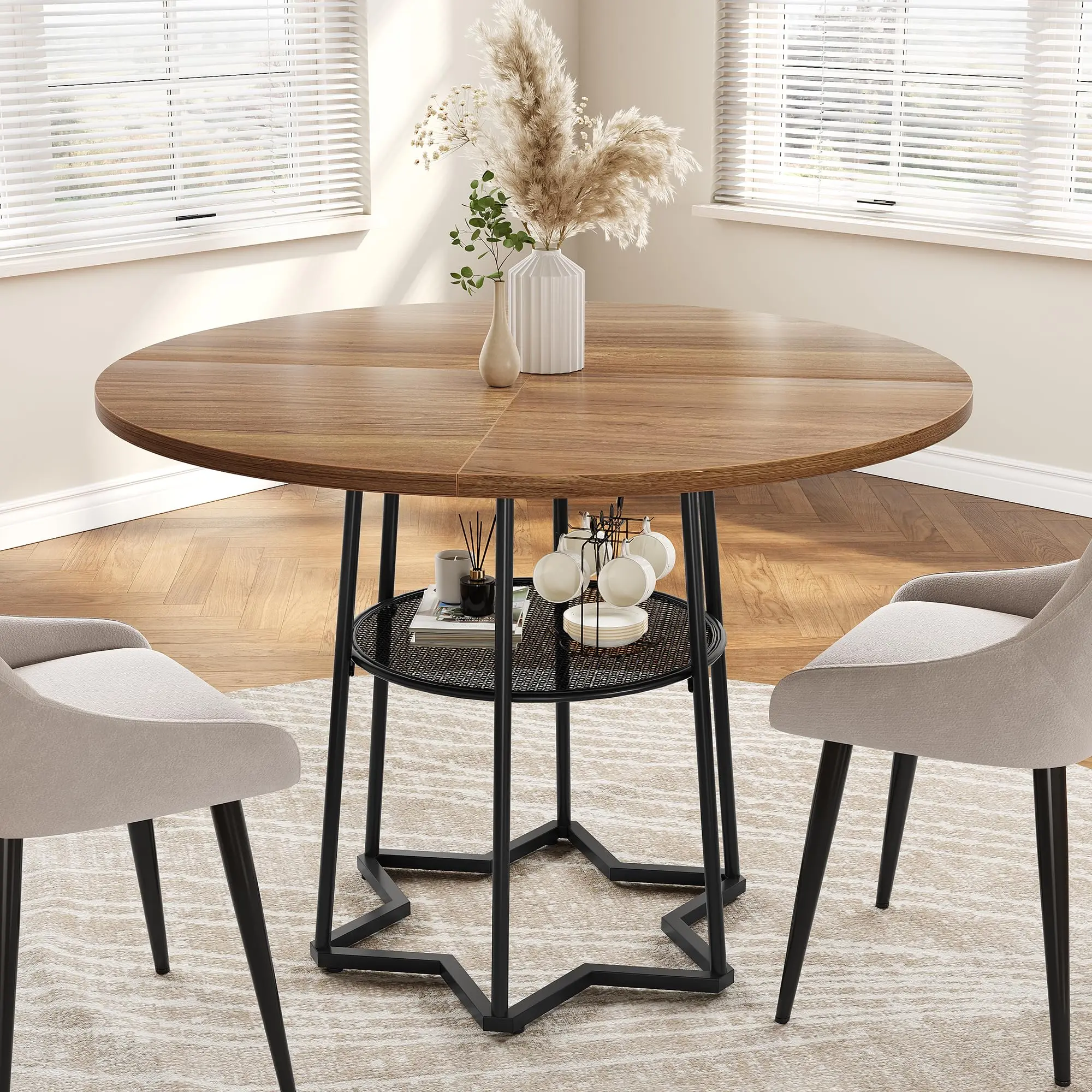5. GARVEE Round Dining Table for 4, 39 Inch Farmhouse Kitchen Table with 17.7 In Storage Space, Heavy Duty Metal Base, for Kitchen Dining Room, Brown