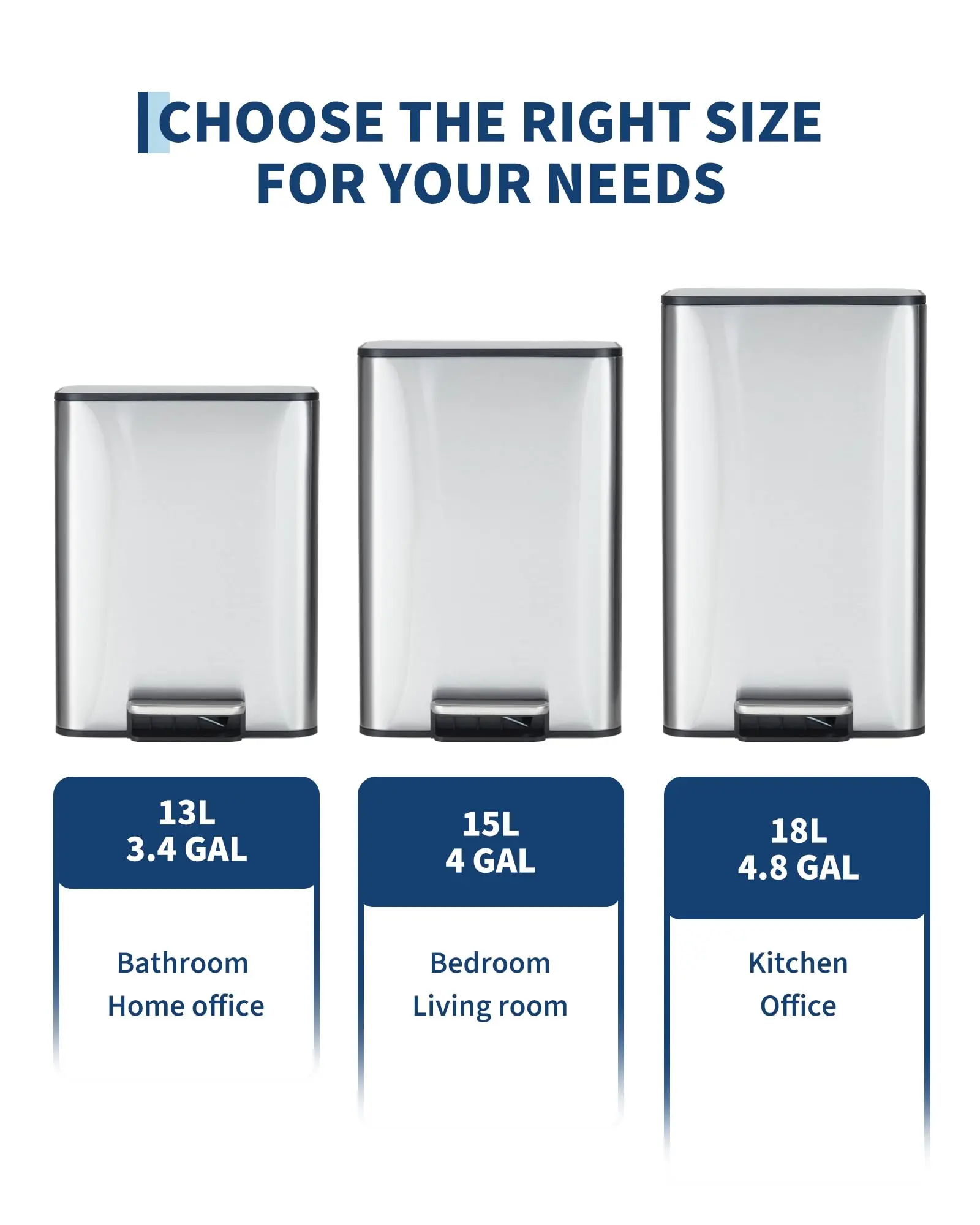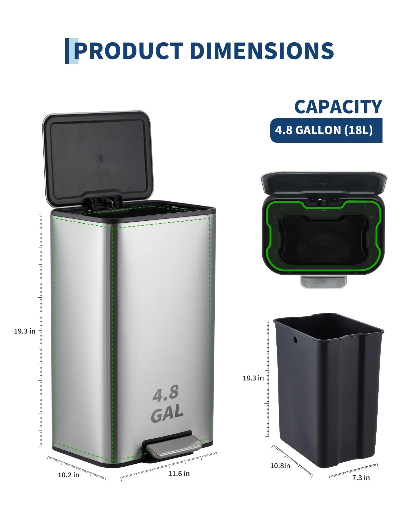 · Premium compact design: 4.8 gallon rectangular stainless steel trash can fits perfectly in office, small kitchen, bathroom or home spaces, offering a sleek silver garbage can with lid that complements modern décor while saving floor space