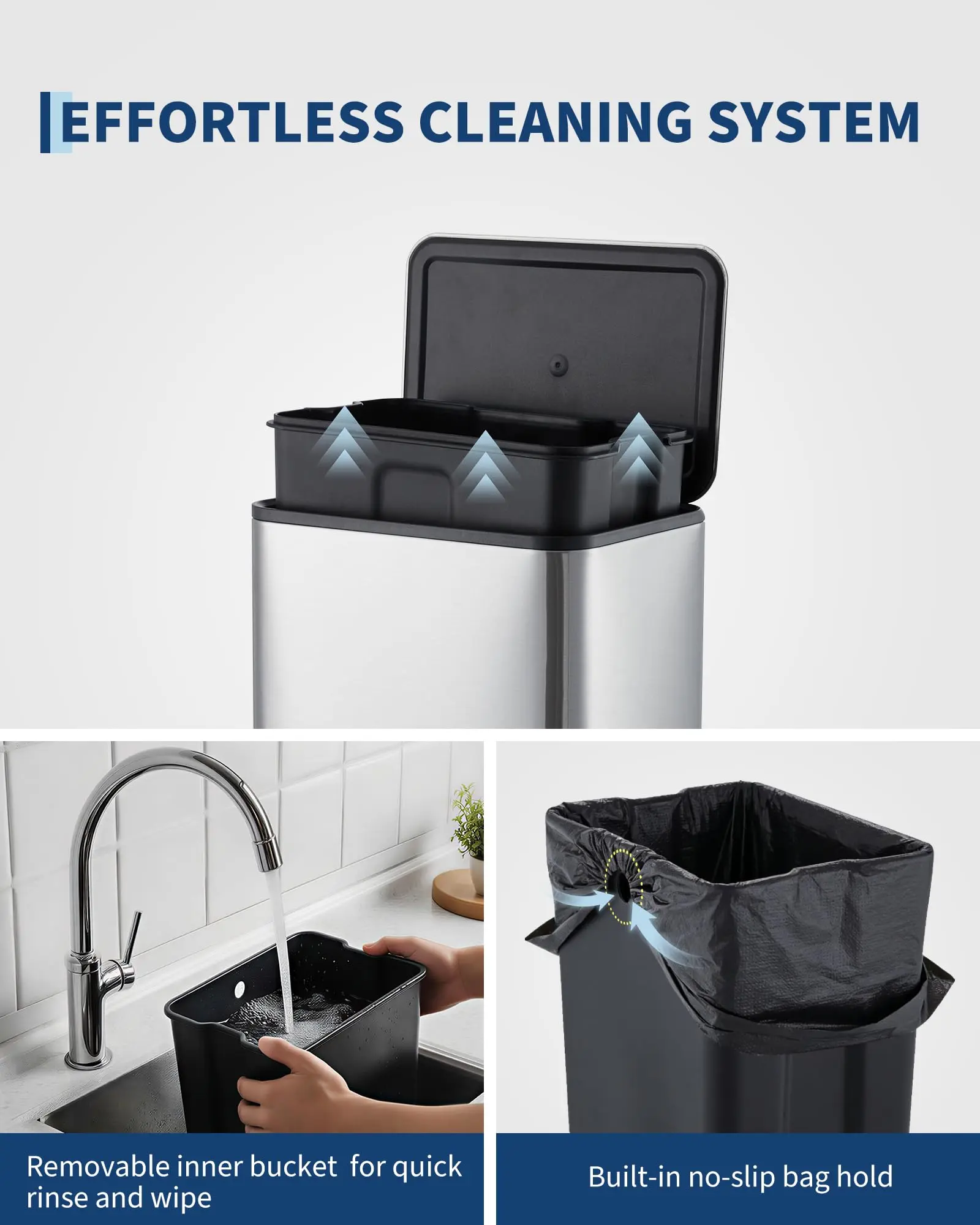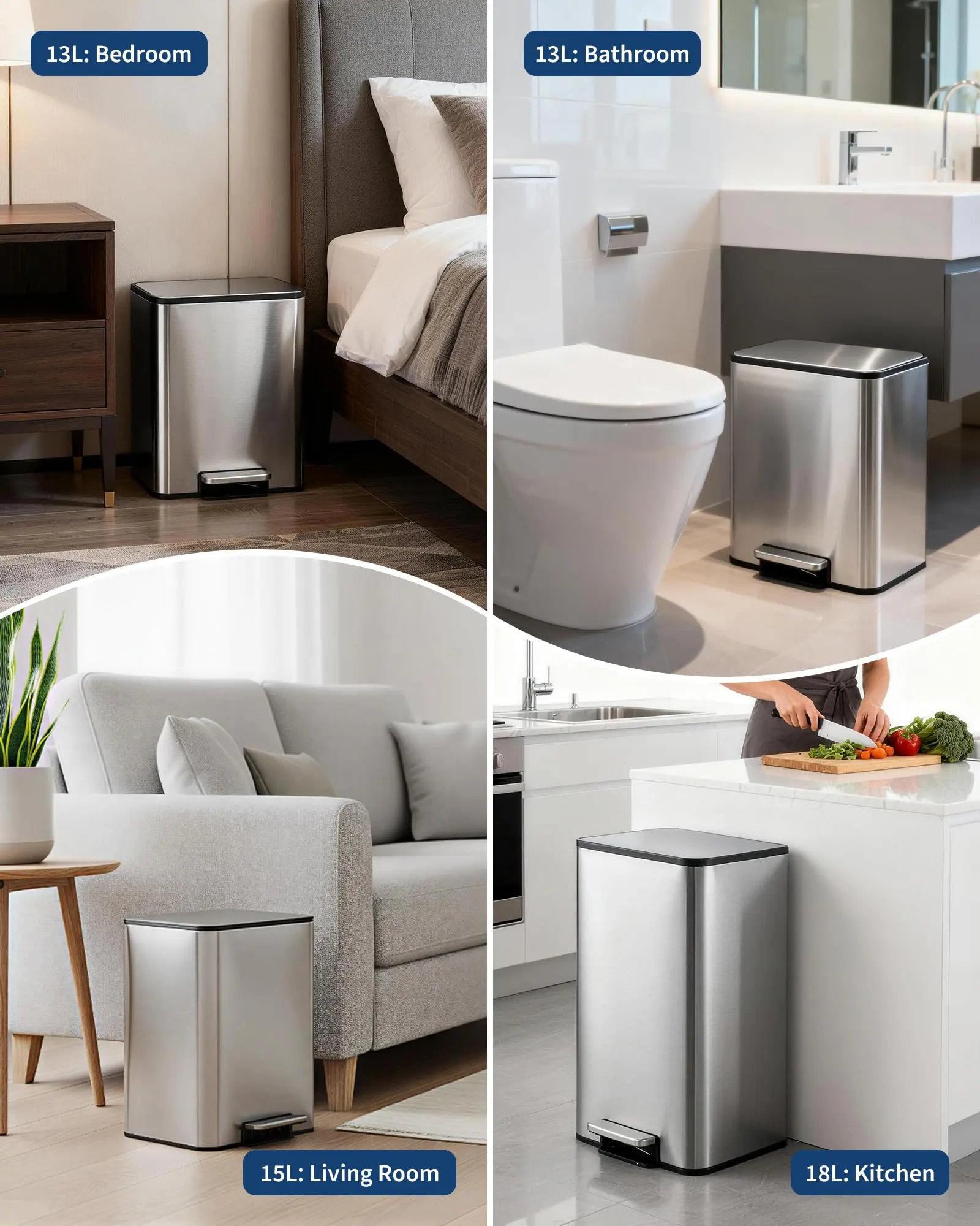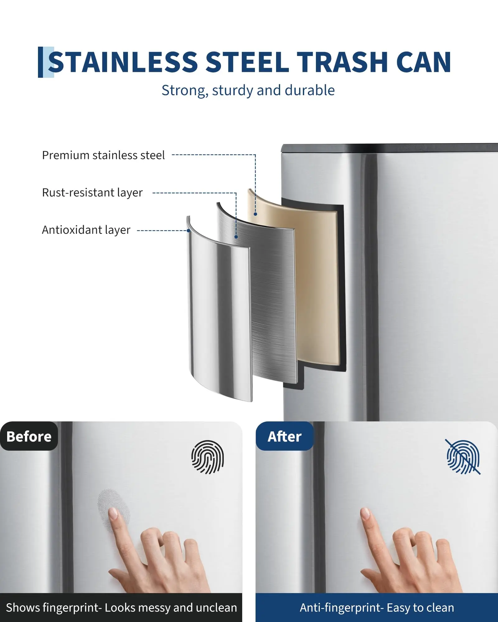 · Durable, fingerprint-resistant: High-quality metal trash can made of sturdy stainless steel resists fingerprints and smudges, ensuring your silver garbage can looks clean longer and delivers long-lasting performance for everyday home use
