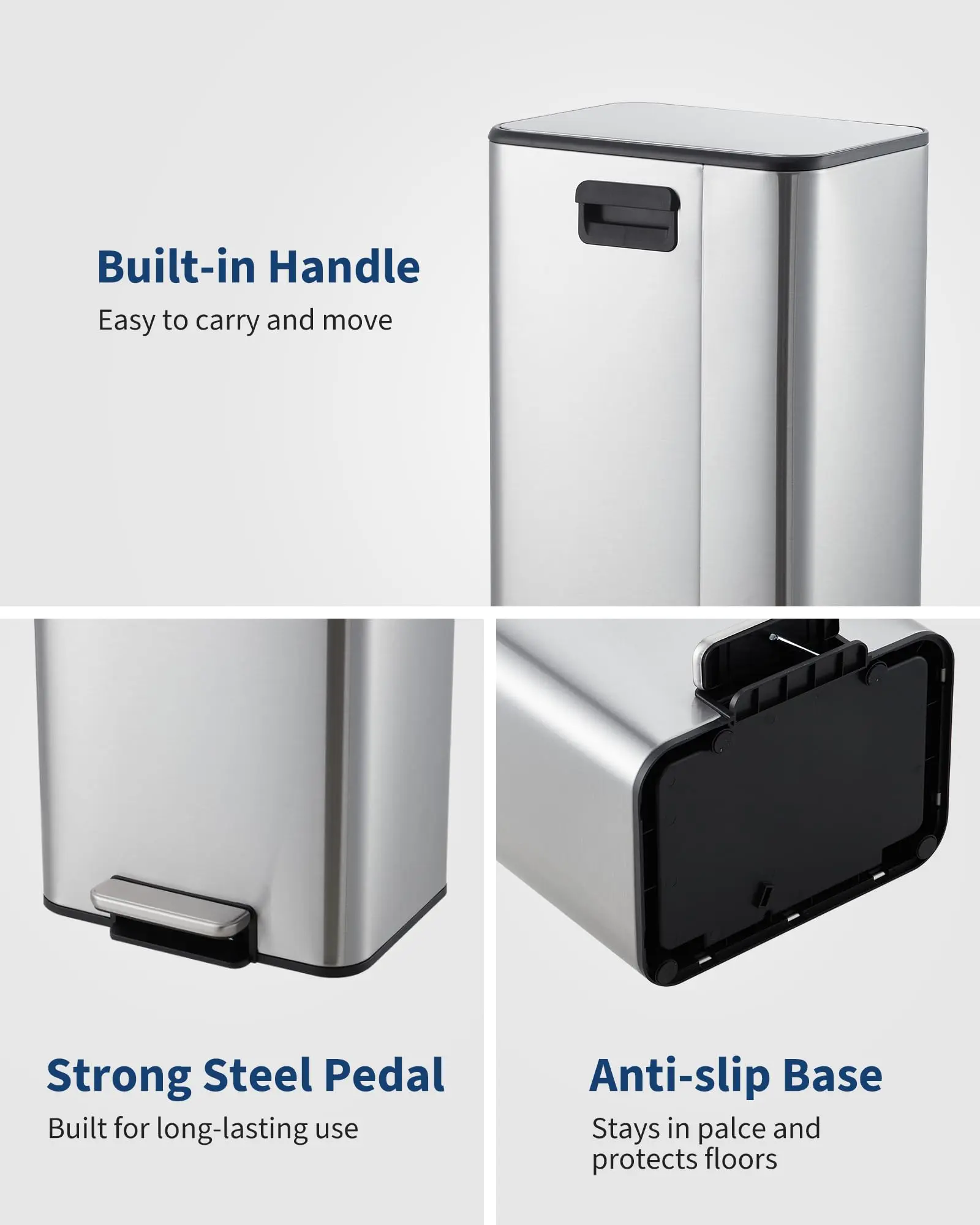 · Quiet foot pedal: Durable step trash can with smooth, hands-free foot pedal operation keeps your hands clean, ideal as an office trash can or kitchen trash can for busy households and workplaces