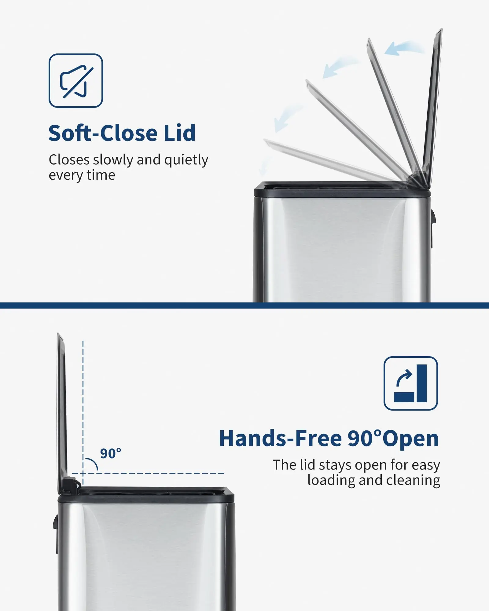 · Soft-close, stays-open lid: Advanced soft-close lid closes quietly to minimize noise, while the convenient stays-open function is perfect for longer tasks like cooking, cleaning or recycling in your home or waste bin for kitchen