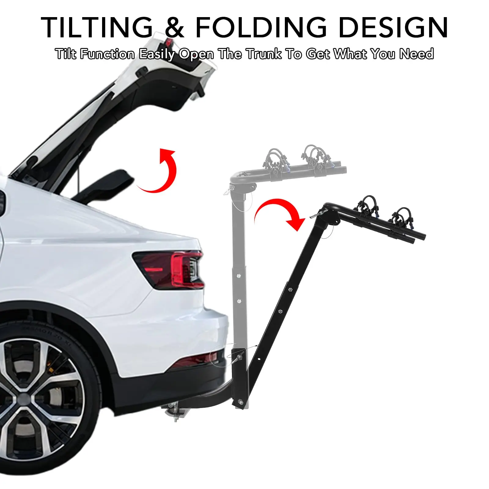 · EASY TO INSTALL & STORE: This hitch mount bike rack arms can be folded when not in use, the bike rack conveniently folds down to a compact size, allowing for easy storage in your garage or trunk. Its foldable design also makes it convenient to access your vehicle's rear cargo area without removing the rack.