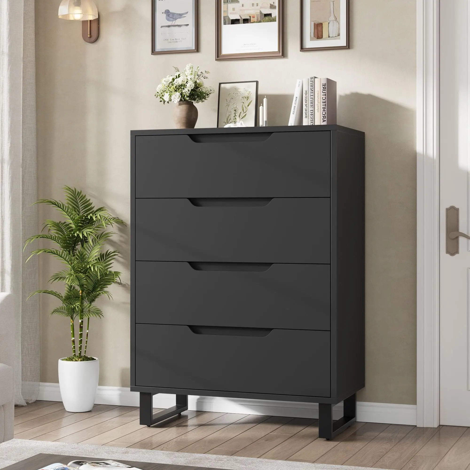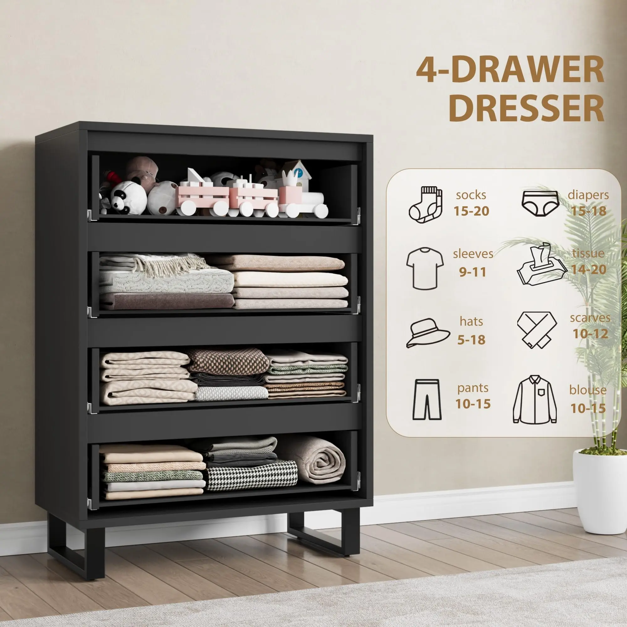 · AMPLE STORAGE SPACE: Featuring 4 deep drawers, the dresser offers plenty of storage for your essentials. The wide desktop provides room for lamps, decor, and small items, helping you keep your space organized and stylish