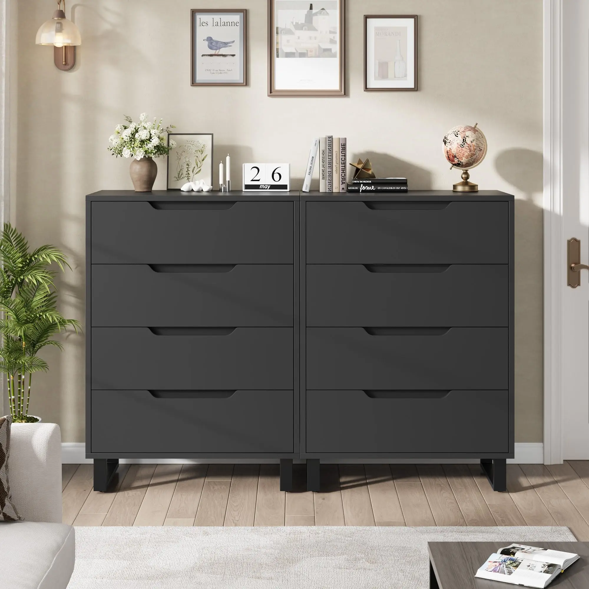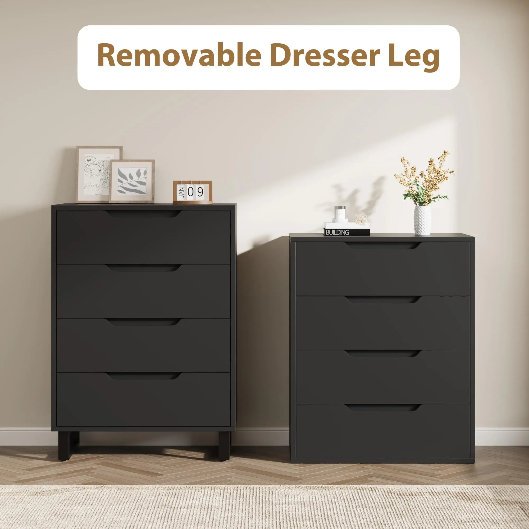 · CHIC DESIGN: The legs of this 4-drawer dresser are detachable, letting you adjust its height to fit your needs. The space beneath allows robot vacuums to pass easily, making daily cleaning convenient and hassle-free