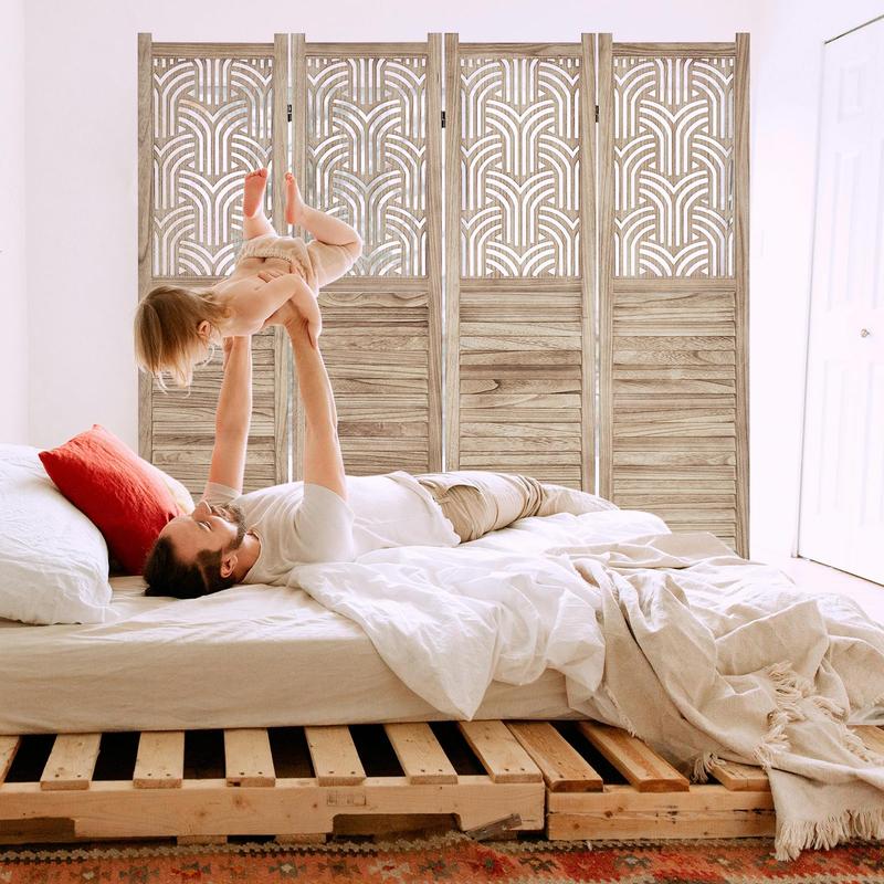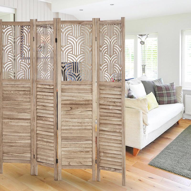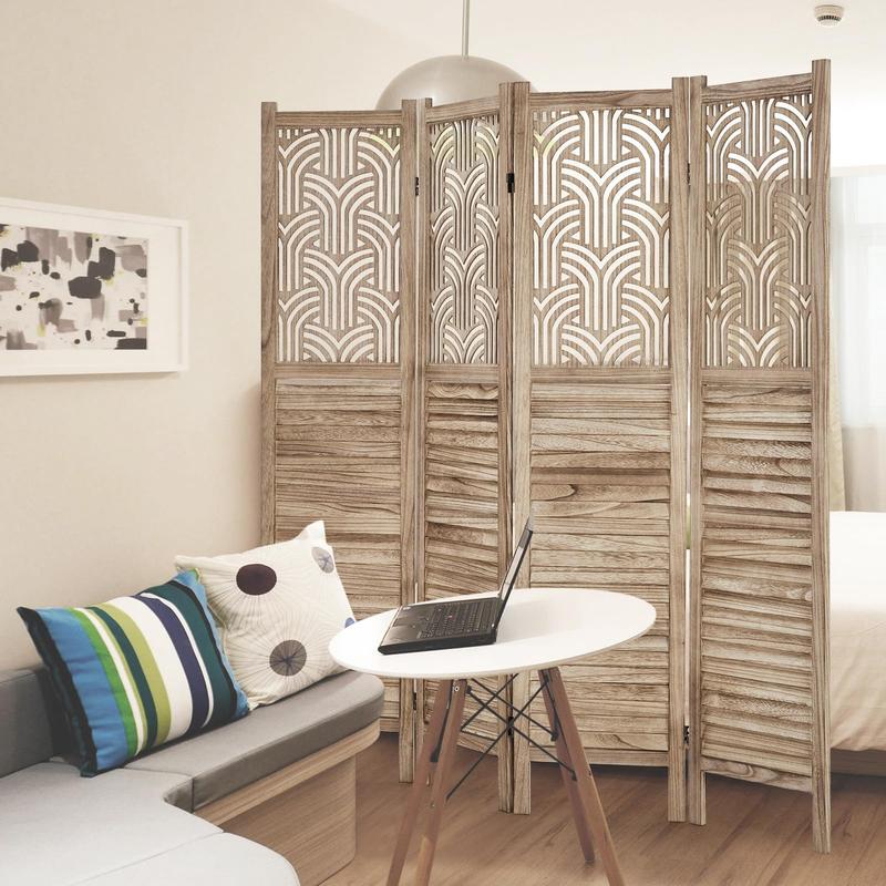 · Cutout Charm: This 4-panel room divider features a beautiful decorative cutout design that allows natural light to filter through, creating a soft, airy ambiance. It enhances brightness while maintaining openness, adding warmth and comfort to any room