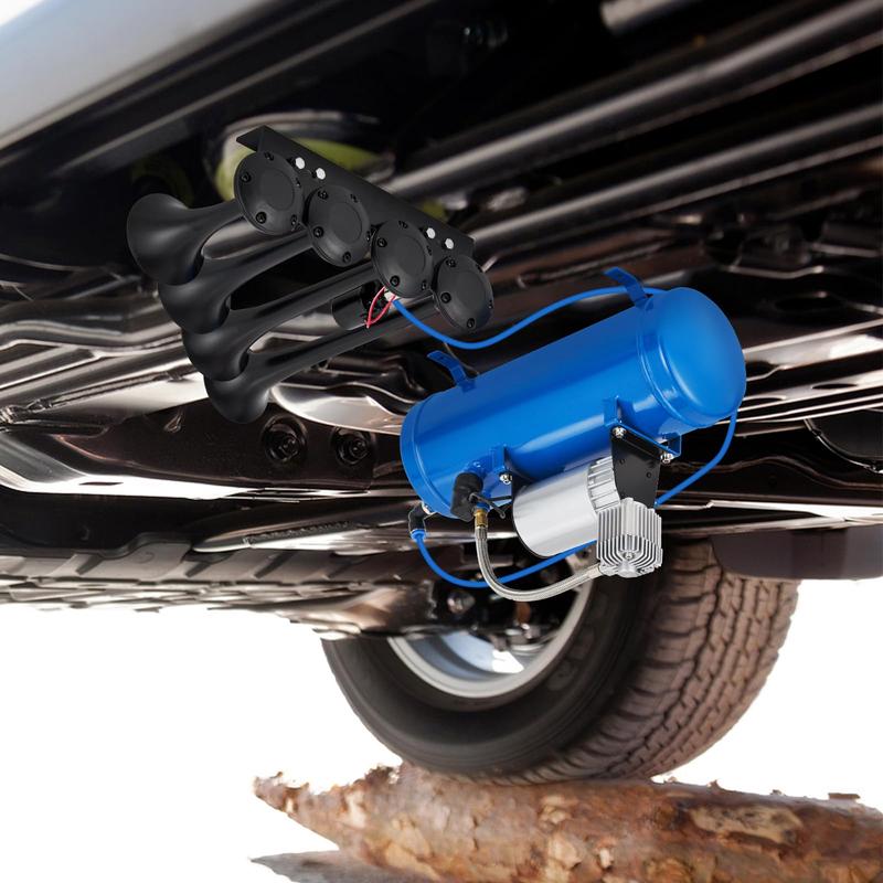 · 150 PSI Compressor: Our train horn's powerful 6L (1.6 gallon) compressor! It features an automatic shut-off that kicks in when the pressure hits 150 PSI, ensuring you stay safe on the road. Plus, with four shock-absorbing pads and a 30 amp fuse for added protection.The Electric Train Horn Kit includes 4 trumpet air horns, a solenoid valve, a 1.6 gallon water tank, a 150 PSI compressor and tubing. (Note: Power switch not included).