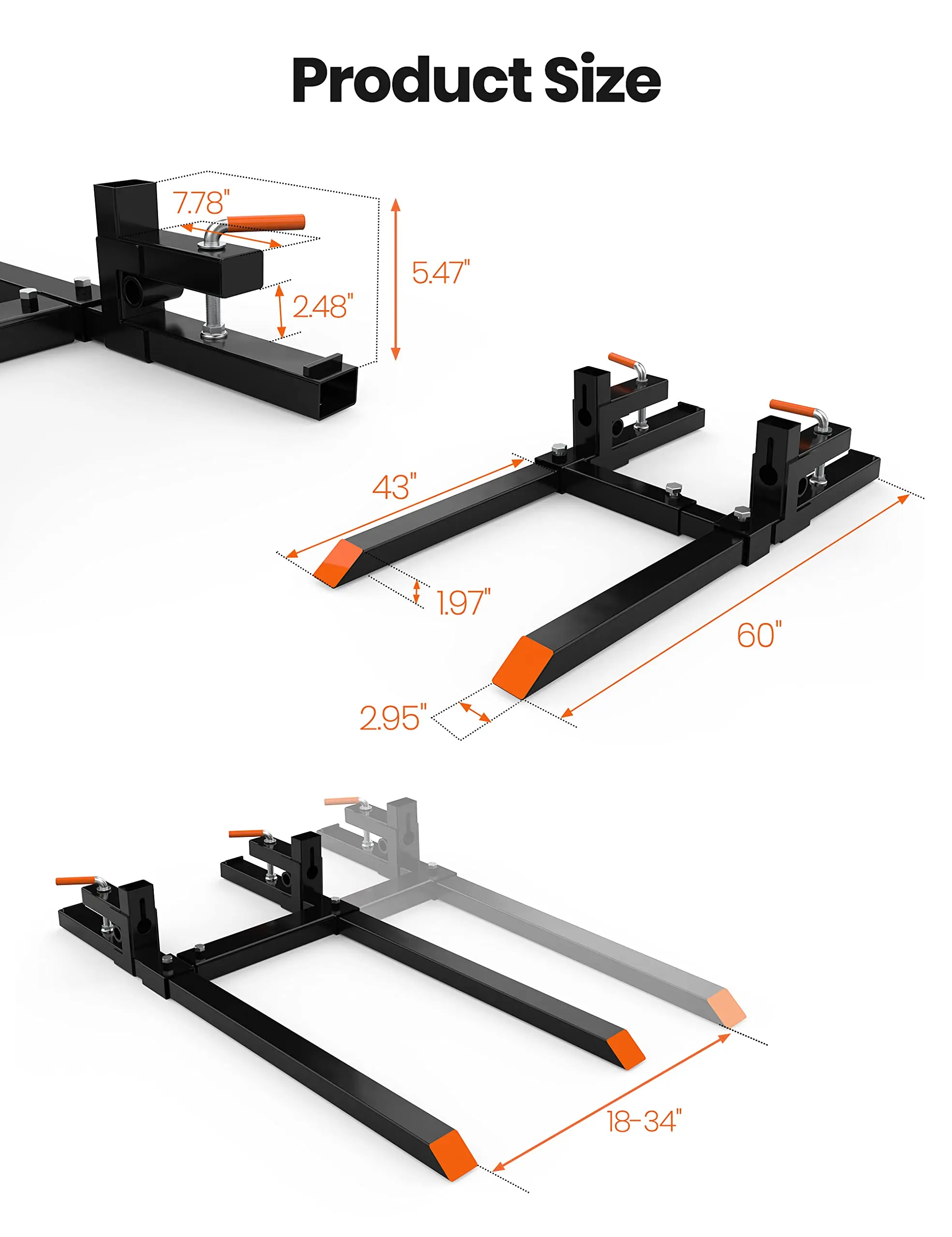 · Dimensions Performance: Measuring 43 in in total length. The included stabilizer bar further enhances usability, and the package comprises 1 x Pallet Forks, 1 x Stabilizer Bar, and 1 x User Manual, ensuring you're ready to tackle any challenge right out of the box.