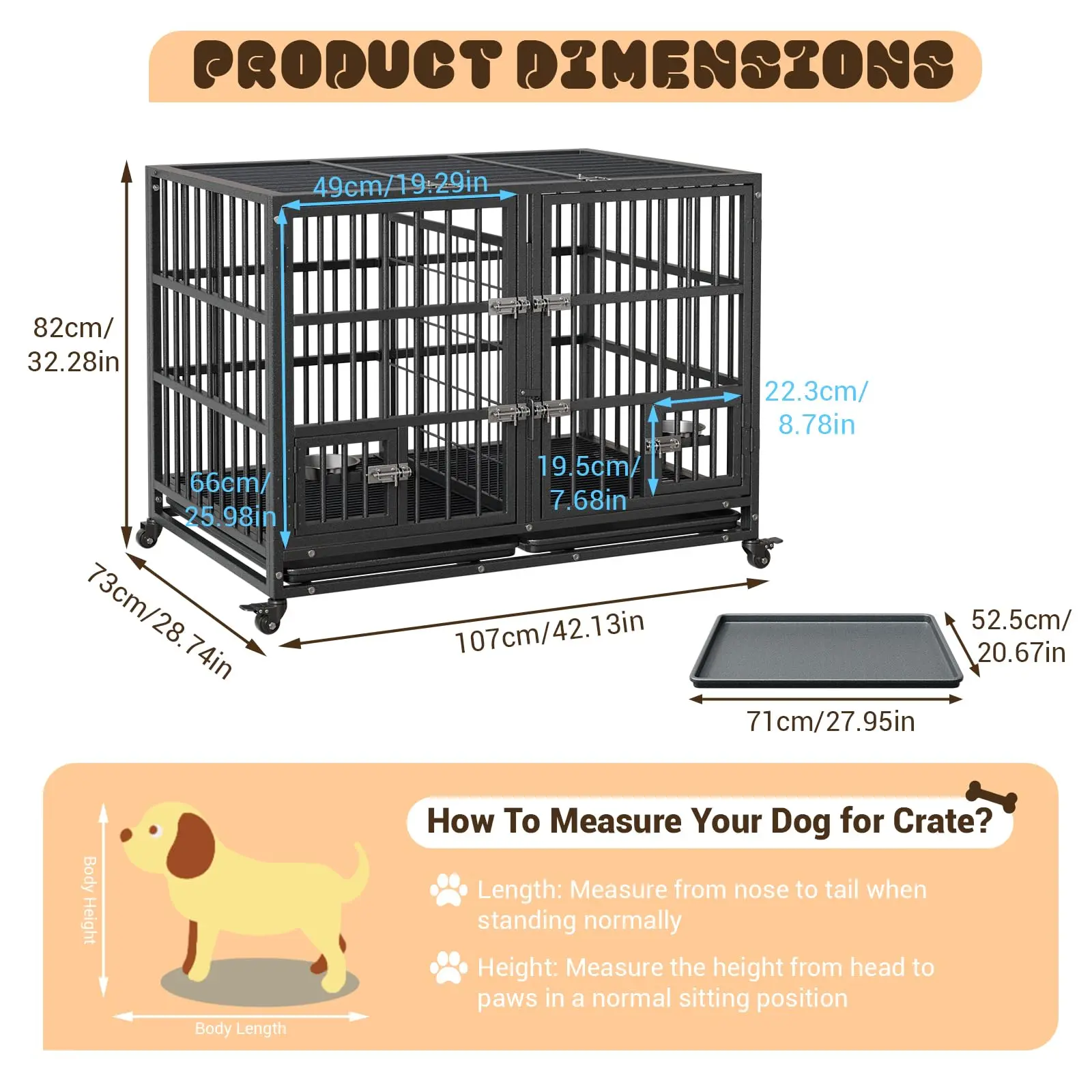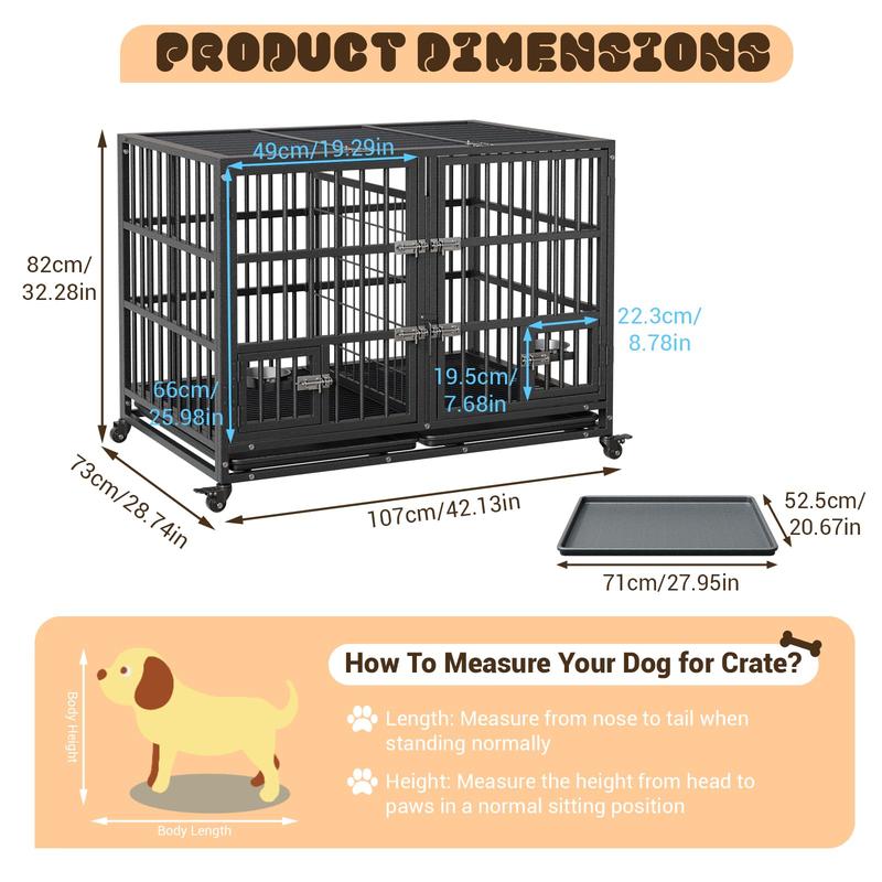 · Portable & Space-Saving – Designed for convenience, this dog cage is easy to move and store. Equipped with smooth-rolling 360° swivel casters, it glides effortlessly around your home or yard, while its compact design allows for simple storage when not in use.