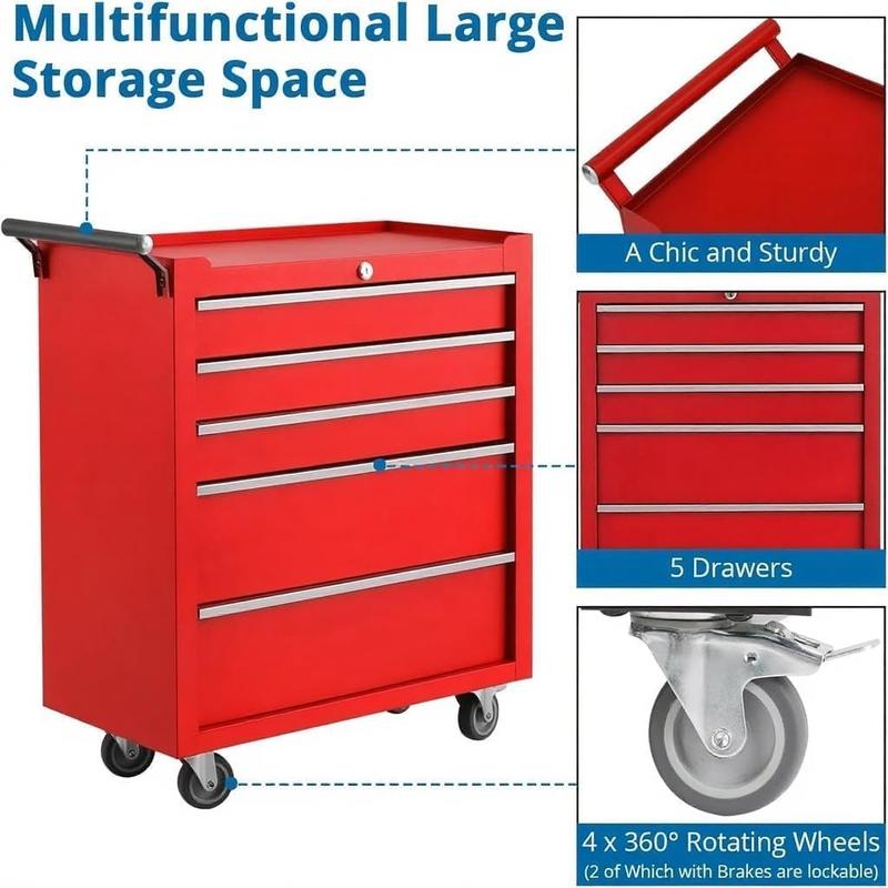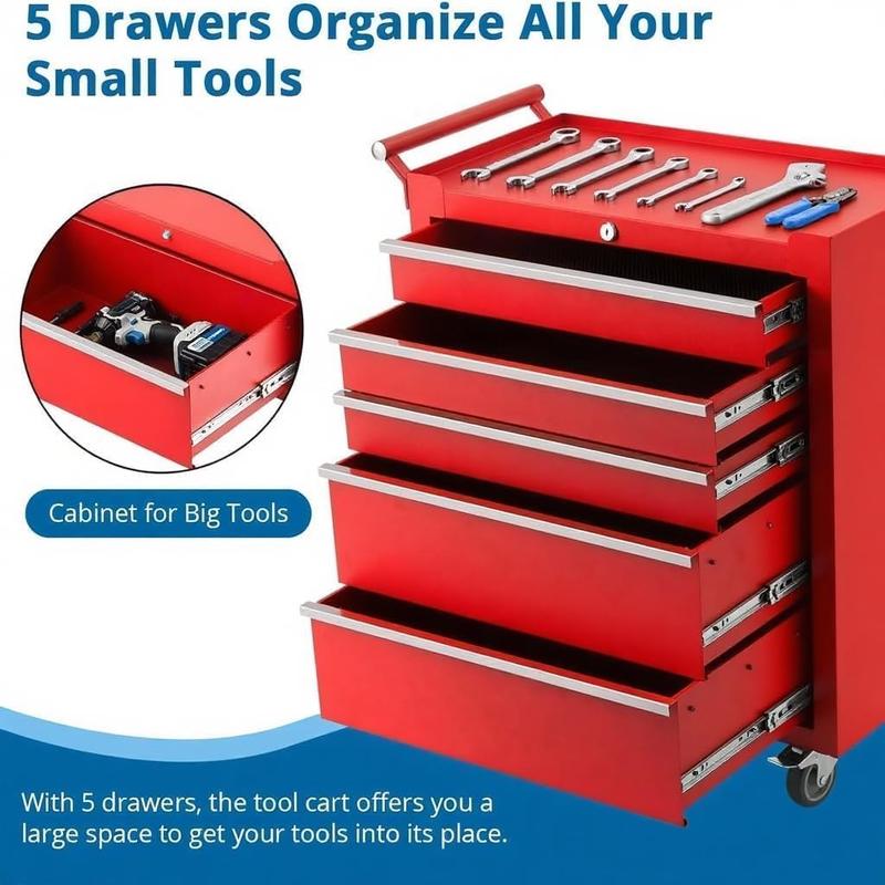 · 【Spacious & Organized Storage】Five drawers with non-slip liners provide ample space to categorize and store tools efficiently, while silver stripes on drawers improve visibility in low-light conditions.