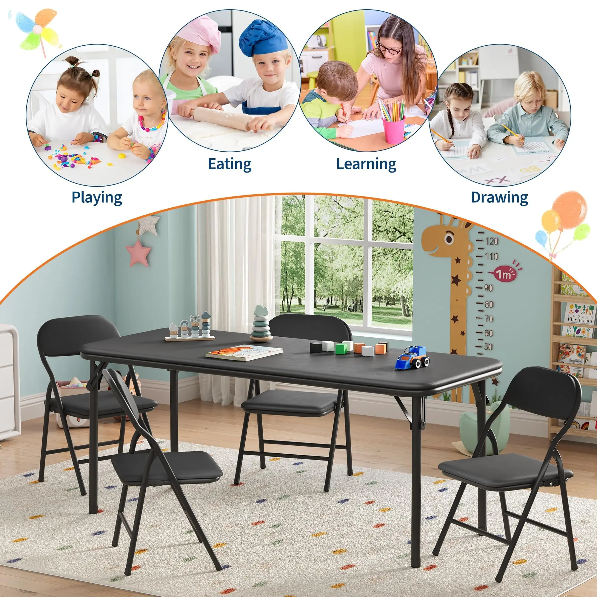 · 【5-Piece Folding Table and Chairs Set】: This folding table and chairs set is designed for kids, featuring a table and four chairs to provide an ideal space for meals, art learning, painting, and games. Crafted with a durable metal frame and thickened PU leather surfaces, it is waterproof, stain-resistant, and easy to clean for long-lasting use. The rounded corner design and anti-pinch structure enhance safety, while the foldable feature saves storage space.