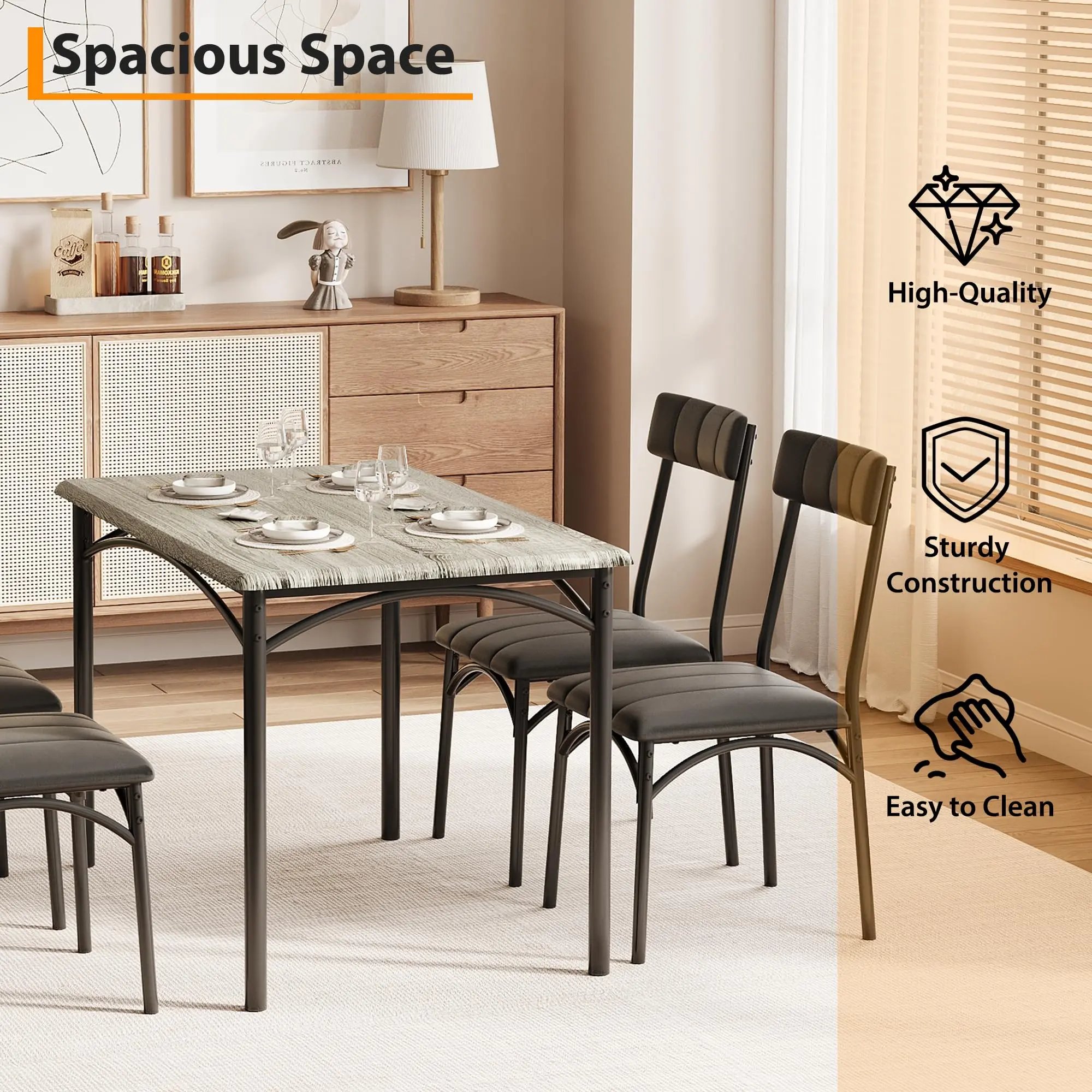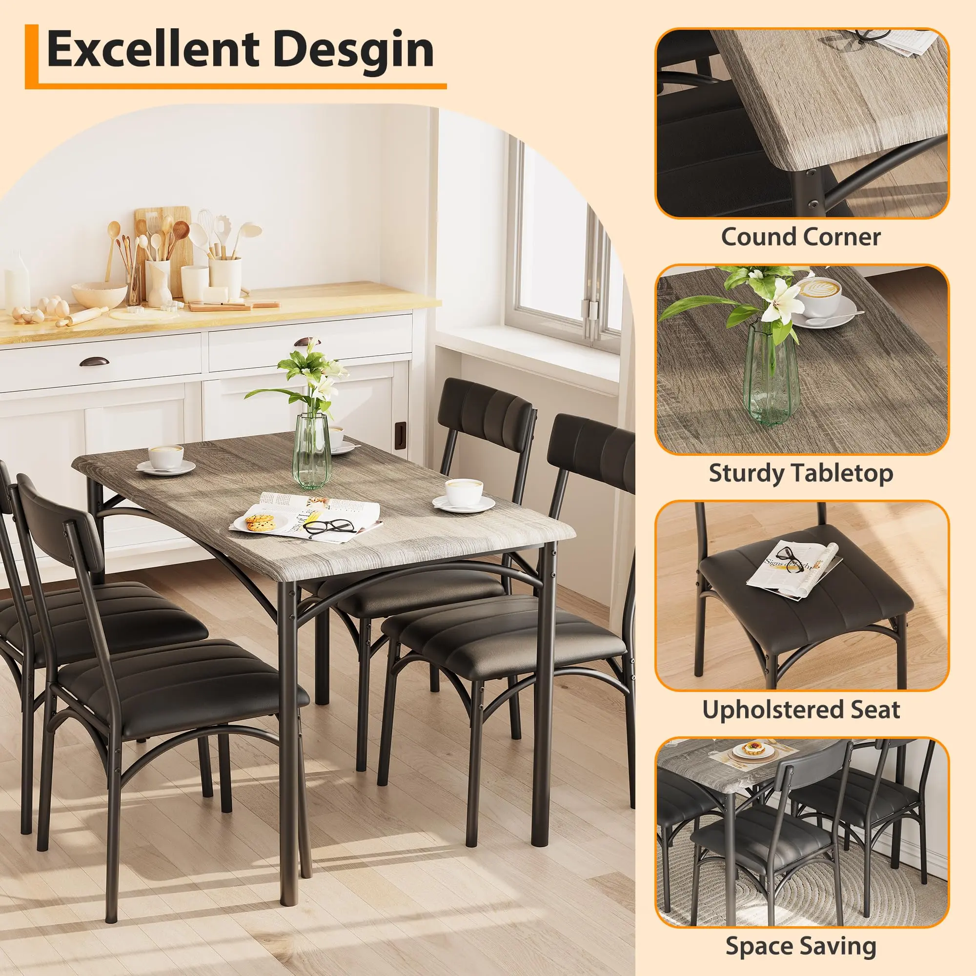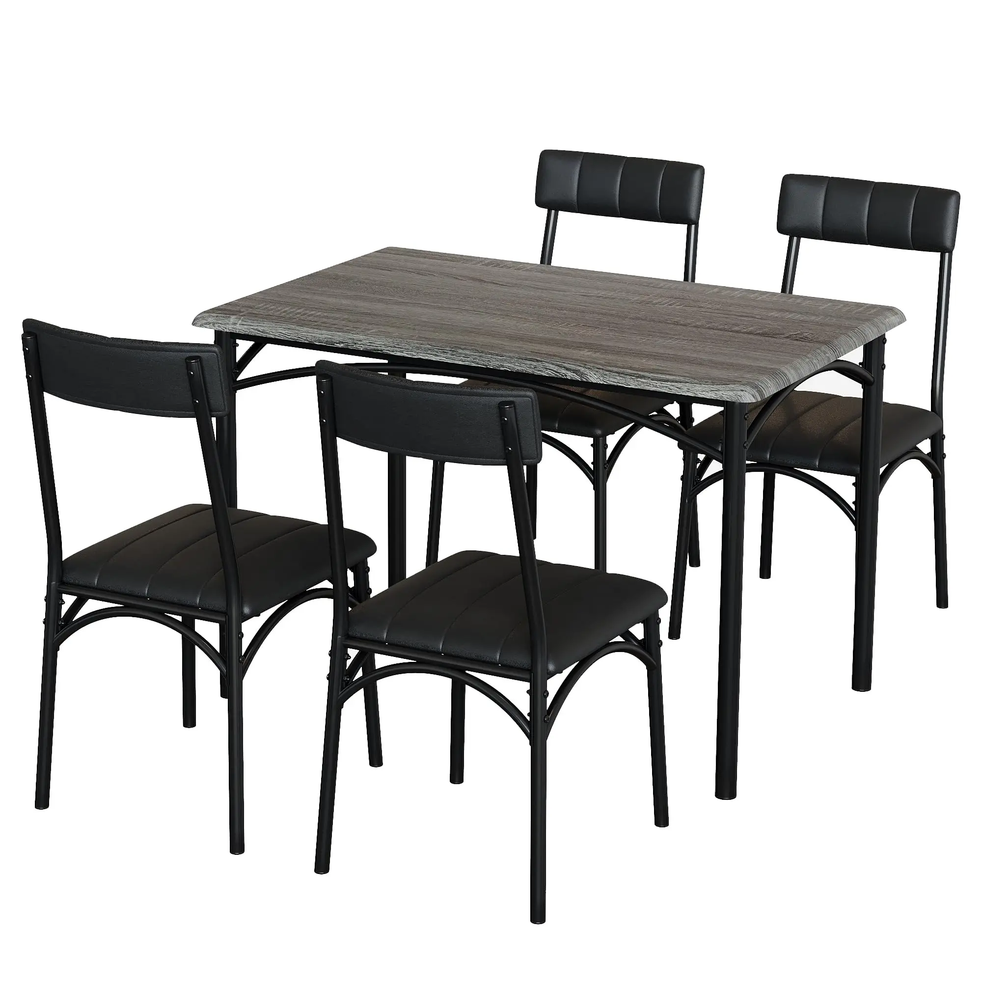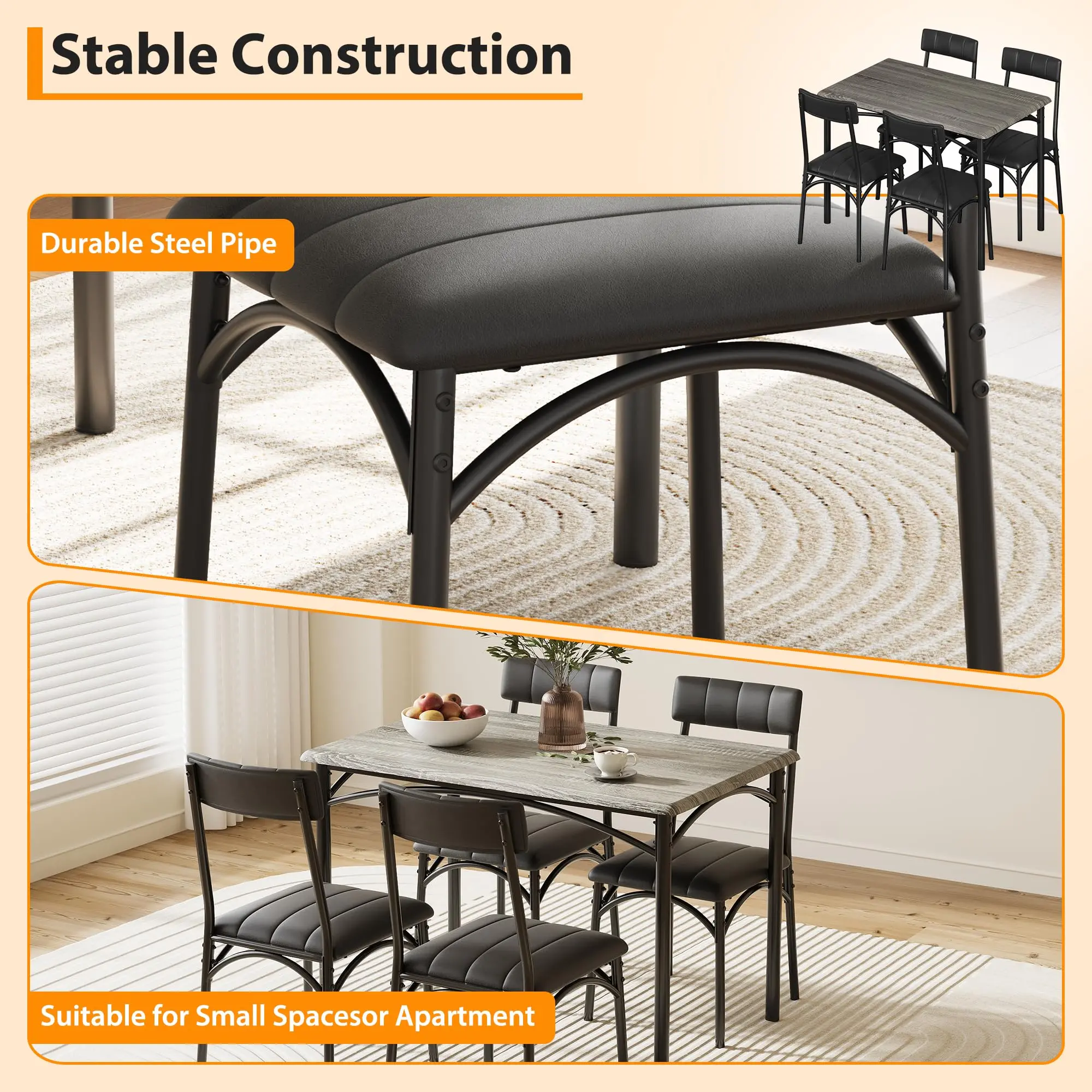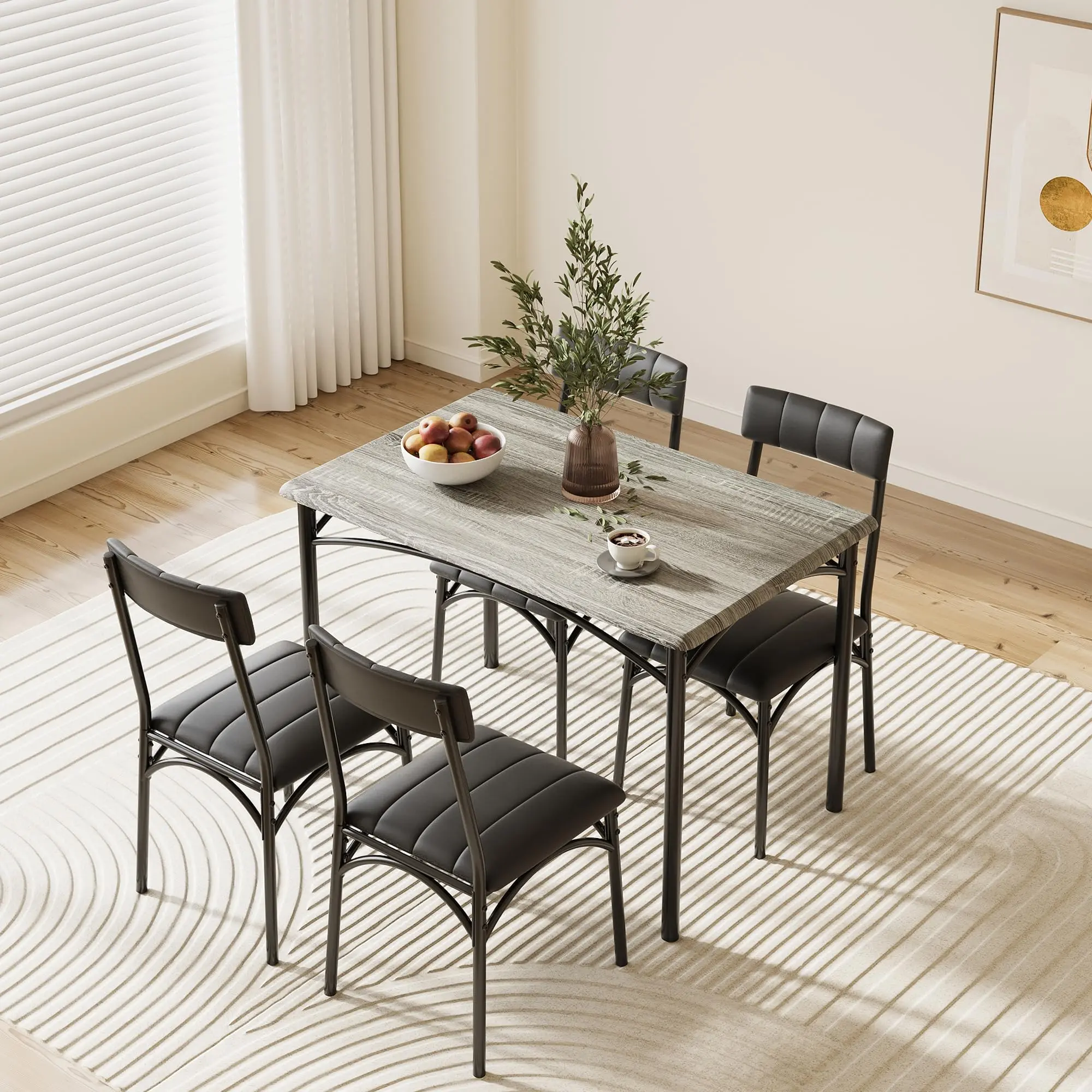 · Space-Saving 4-Piece Dinette Set:This 5-piece dining set includes a sturdy rectangular table (43.3"L x 27.5"W) and 4 cushioned chairs that conveniently tuck underneath when not in use. Perfect for small spaces like kitchens, breakfast nooks, or apartments while seating up to 4 people comfortably.