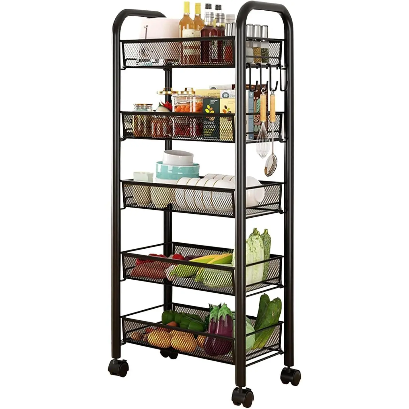 · FOR LONG-TERM USE: The 5-tier rolling metal cart features a robust and durable powder-coated steel frame that is strong, resilient, and long-lasting. The mesh at the bottom of the baskets ensures efficient airflow, prevents liquid accumulation, and keeps your items clean.