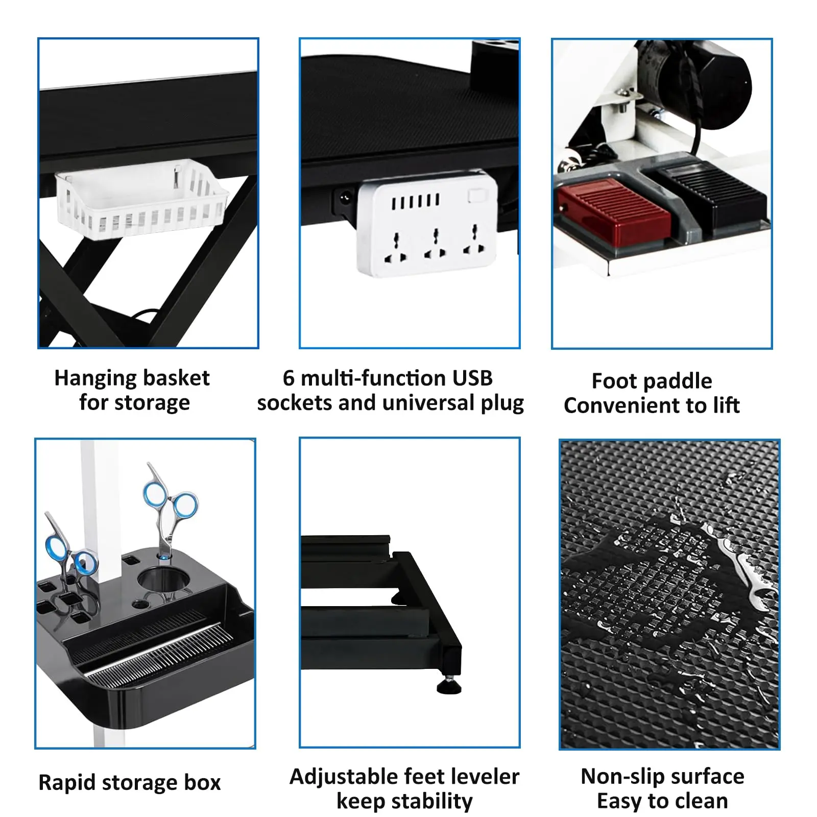 · Functional & Convenient: Adjustable base and arms, and the wide range of accessories will ensure relaxing grooming sessions for both pets and groomers. Storage box to keep beauty tools at hand; AC outlet and USB port add-on for easy access to grooming equipment; Use with grooming noose, adjustable arms, and restraint ring to keep pets in position for prolonged grooming with injury prevention