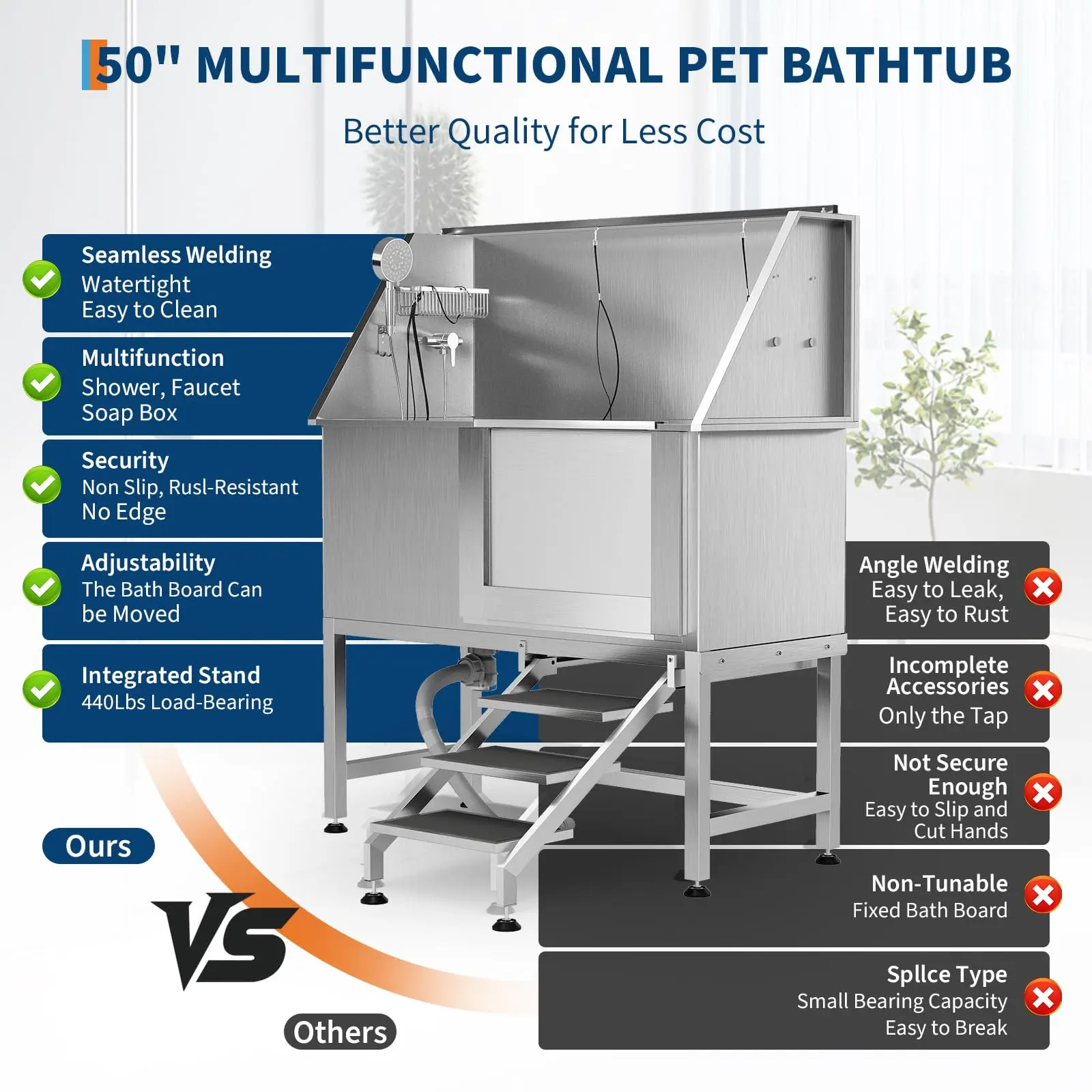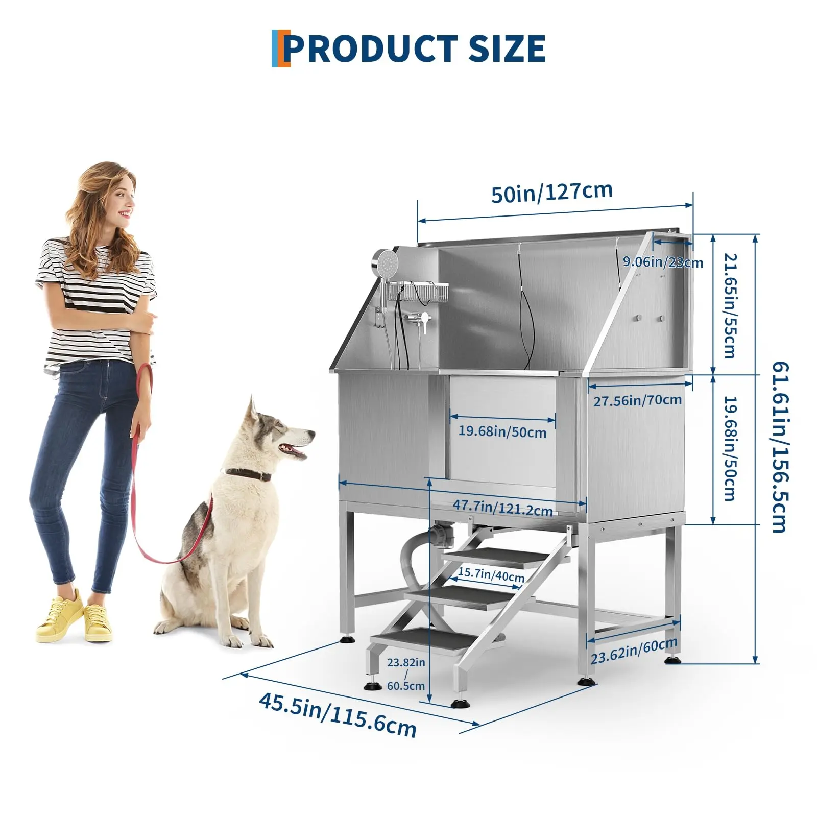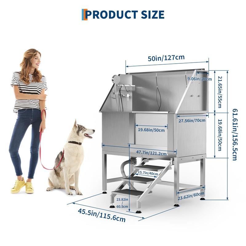 · 50" Stainless Steel Grooming Station Professional-grade corrosion-resistant steel construction, rubber stabilizer feet, and 330 lb capacity. Accommodates pets of all sizes for home or commercial grooming use.