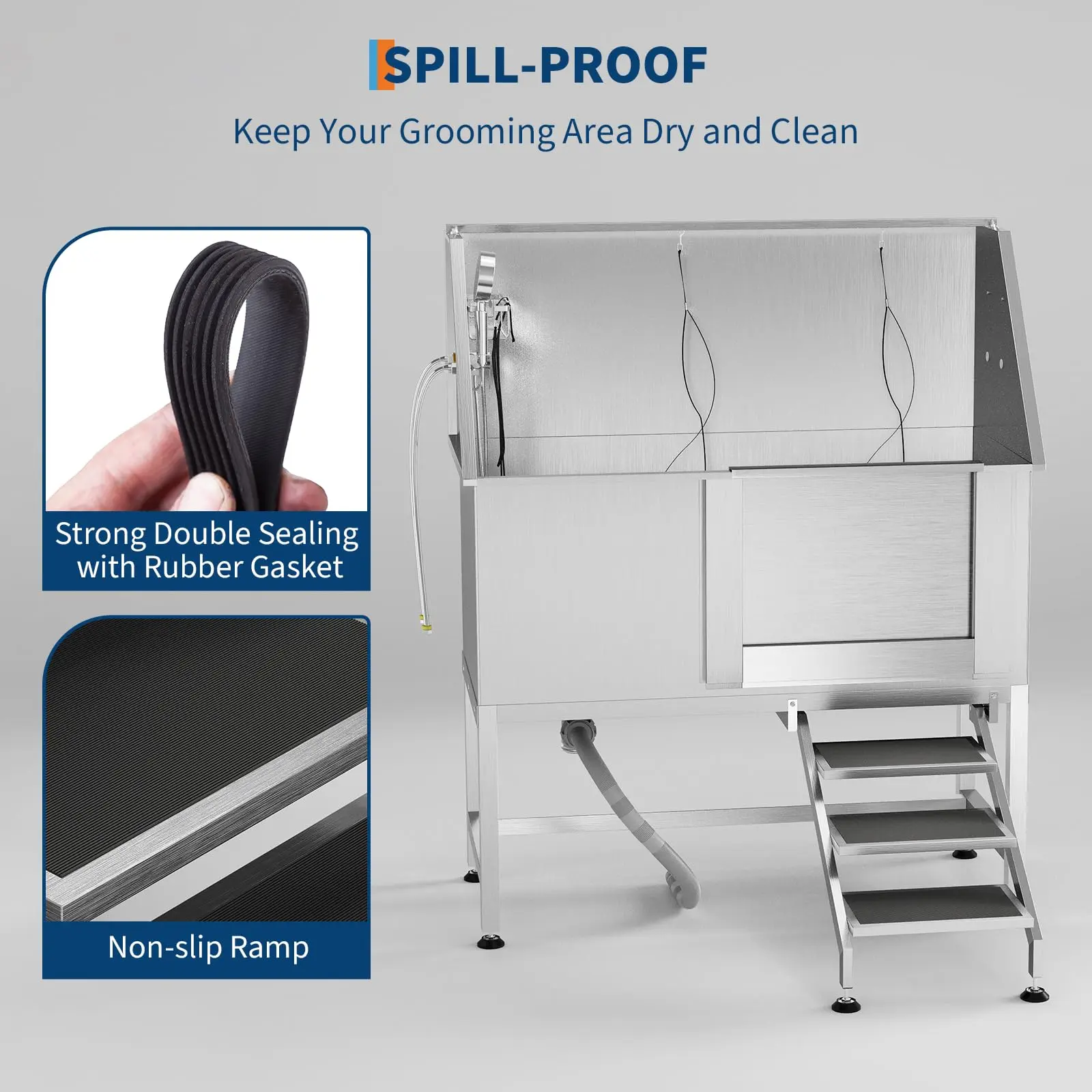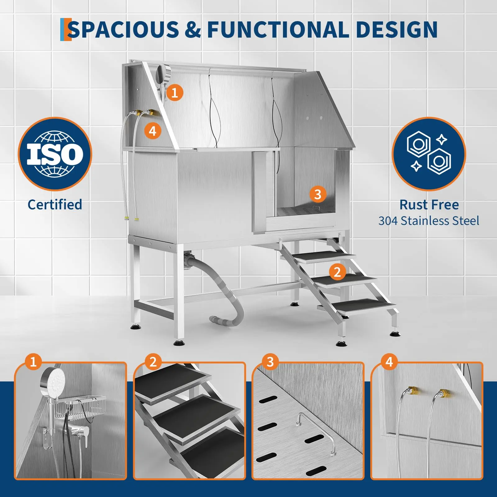· Safety-Equipped Wash Tub Includes non-slip access ramp, storage cabinet, and locking gate mechanism to secure pets during bathing procedures.
