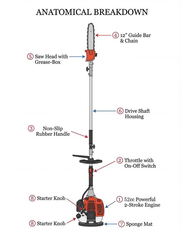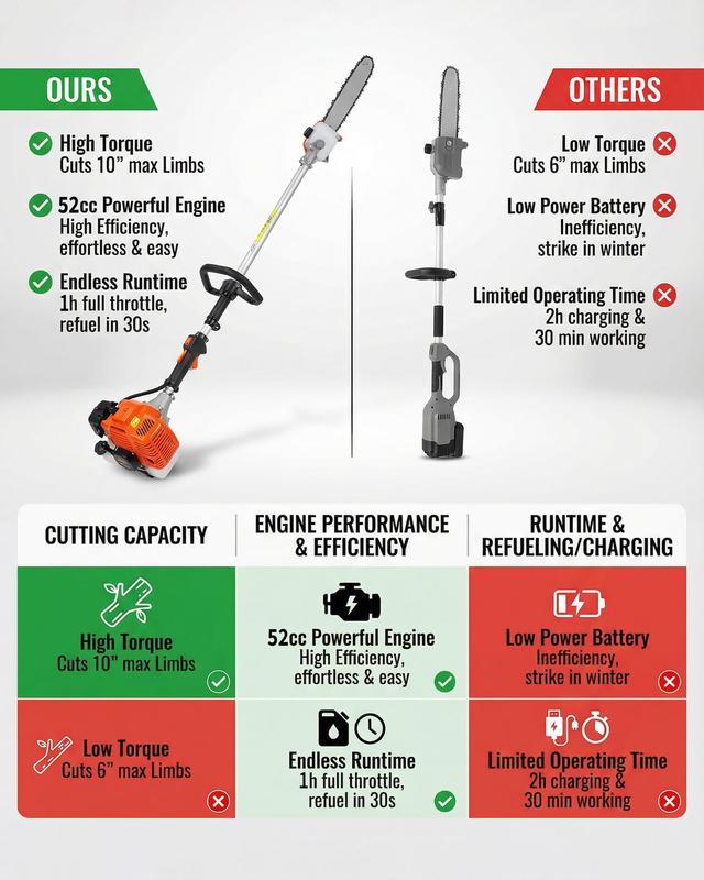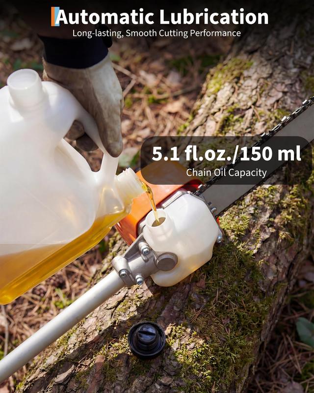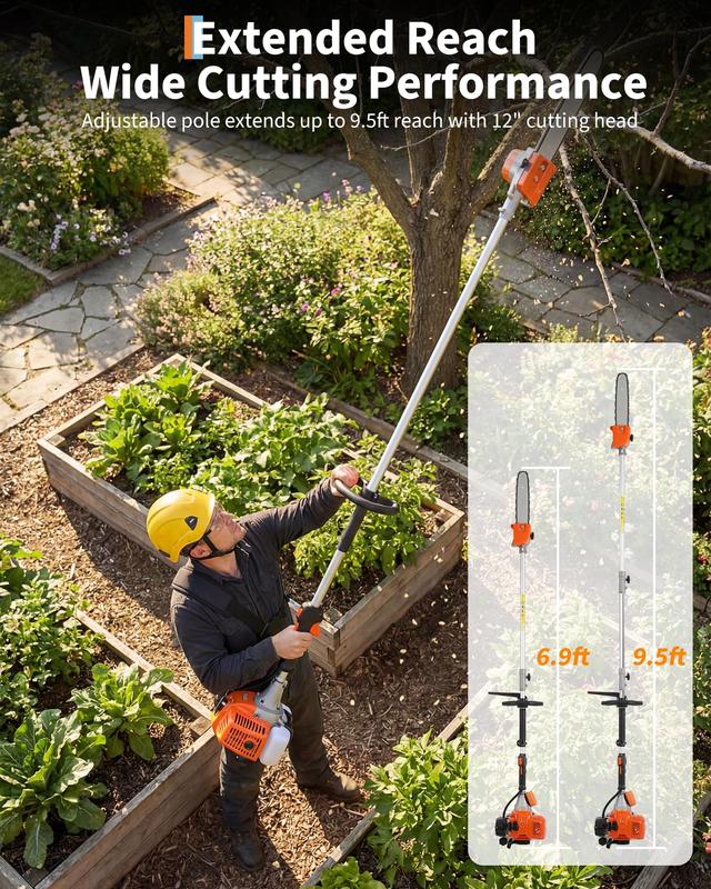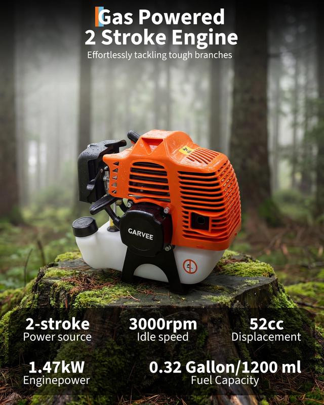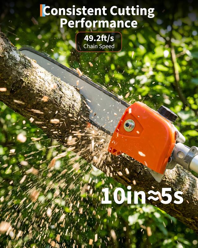 · 【Powerful & Efficient Cutting Performance】-Experience professional-grade power with our 52cc 2-stroke engine. This gas pole saw delivers a fast 49.2ft/s chain speed, cutting through 10-inch thick limbs in about 8 seconds for effortless tree trimming. Its high torque ensures consistent performance, making quick work of your toughest pruning jobs.