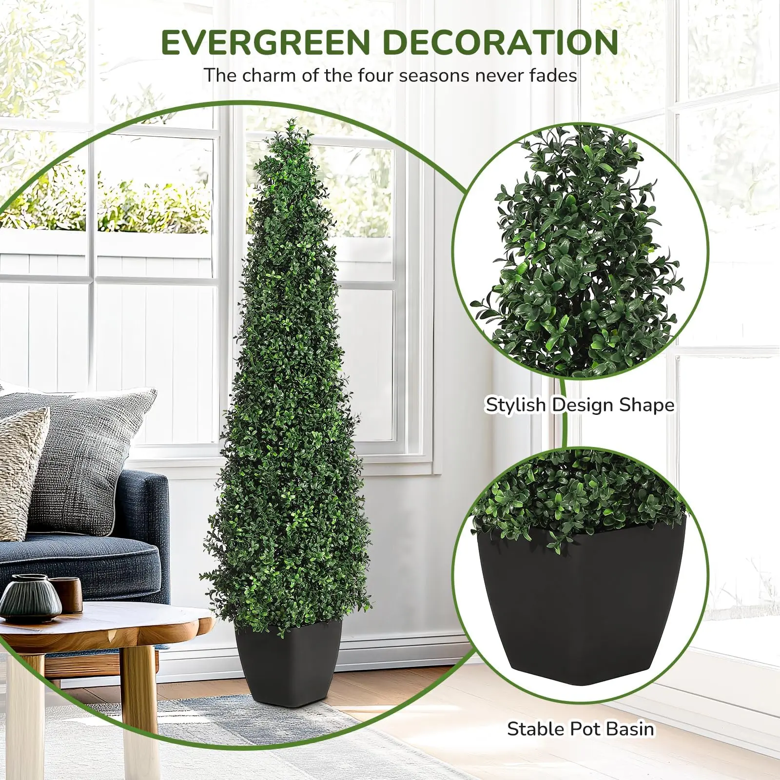 · No Assembly Required – Ready to use straight out of the box! Simply unbox, fluff the leaves (if needed), and place in your preferred spot. For an elevated look, pair with a larger decorative planter (not included).
