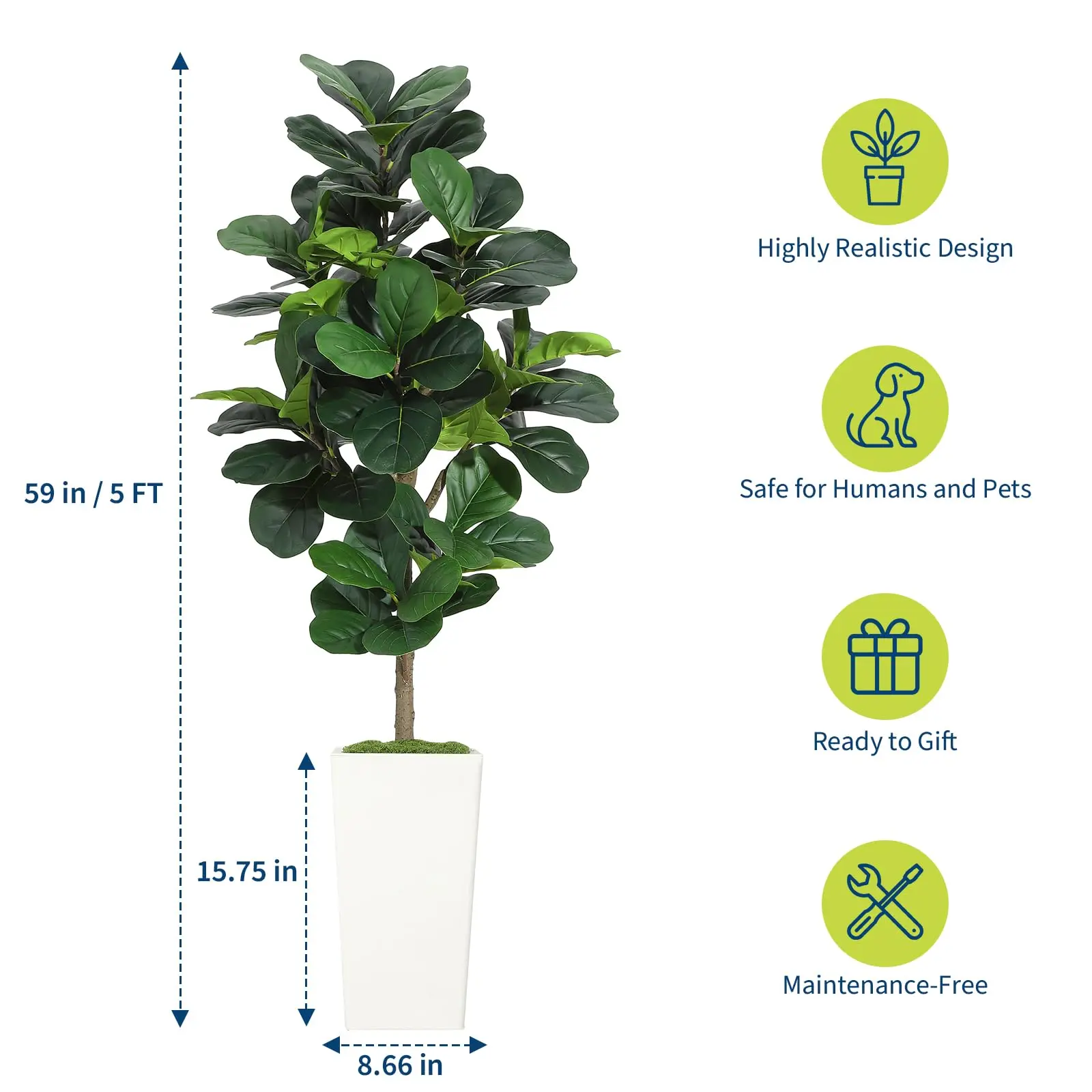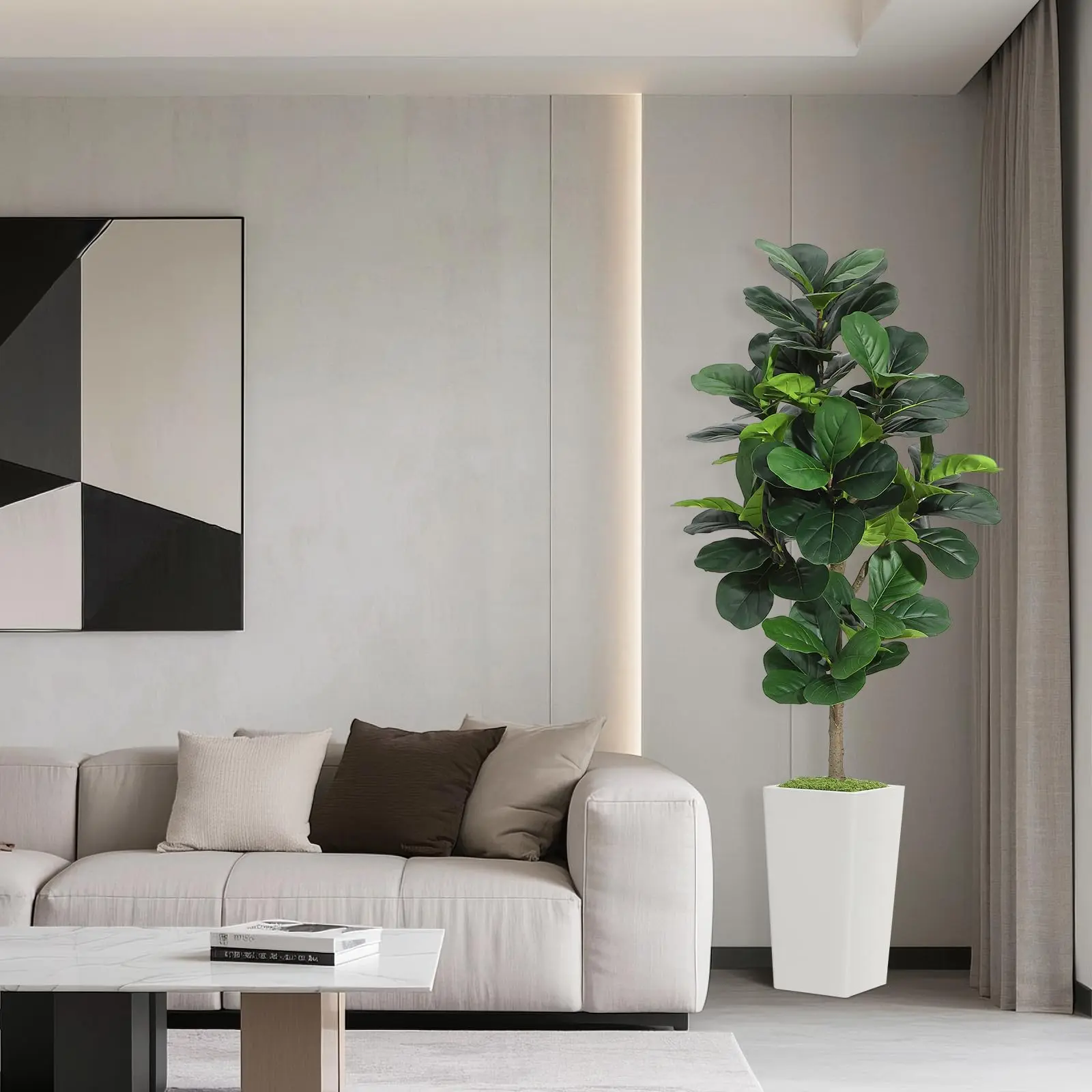· Versatile Decor Solution: The ultimate solution for effortless botanical style, this artificial fiddle leaf fig tree breathes life into empty corners, living rooms, bedrooms, or offices. Perfect as a realistic fake plant with modern planter for renters who can't keep real plants alive, busy homeowners wanting hassle-free decor, or businesses seeking always-perfect ficus lyrata fake plants with pots that require zero maintenance yet deliver maximum visual impact.
