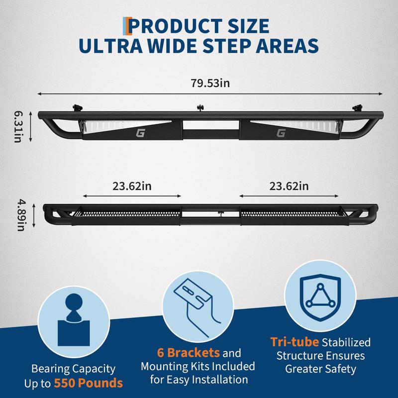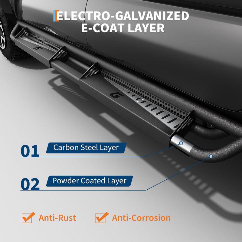 · 🛡️【3D PROTECTION SYSTEM】Patented triple-tube construction protects rocker panels from road debris, boulder strikes, and undercarriage hang-ups. Full-length side skirts prevent mud/dirt accumulation in door jambs during off-road adventures.