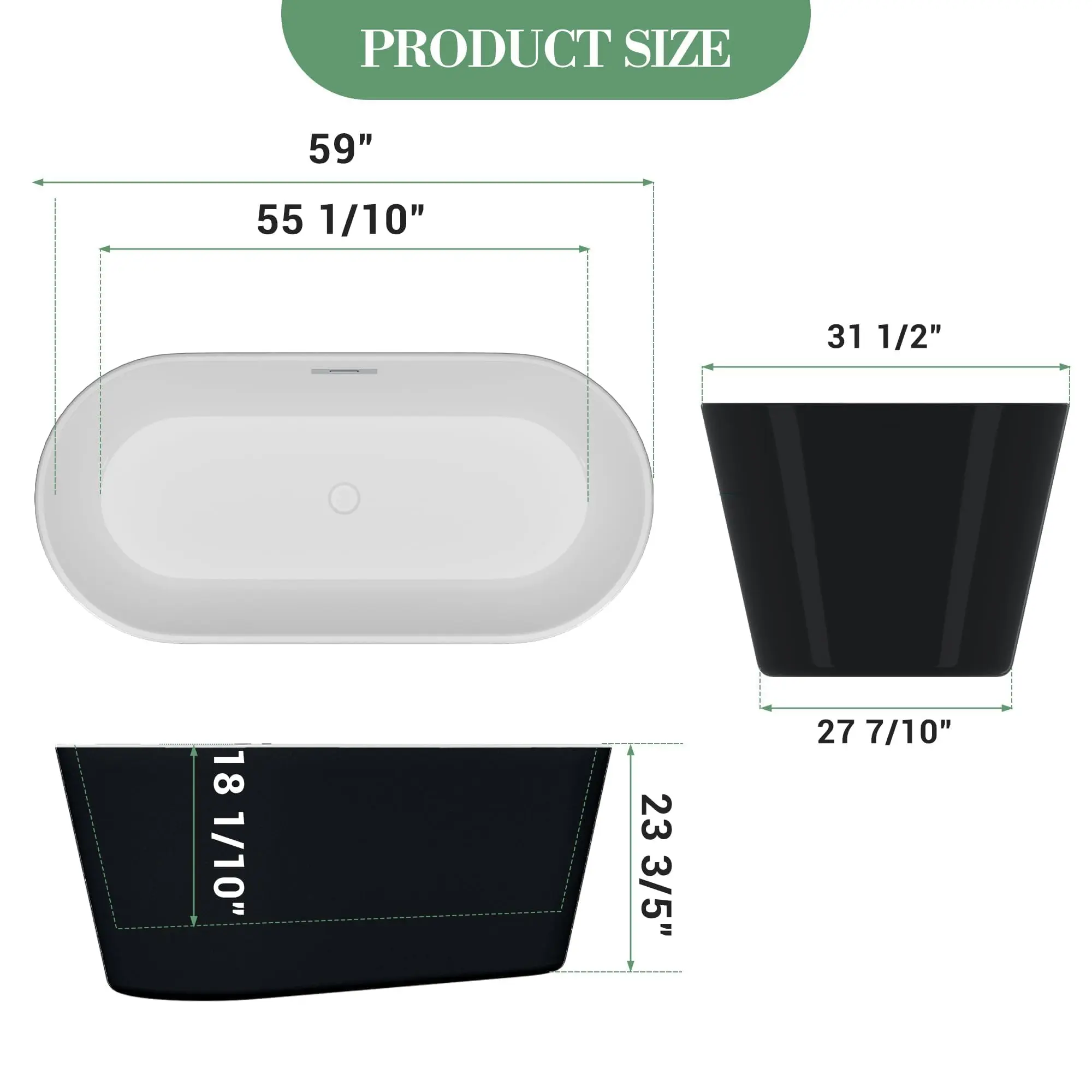 Color : Black Symmetrical Material : Acrylic, Fiberglass Brand : Garvee Style : English Finish Type : Glossy Item Weight : 109.8 pounds Installation Type : Freestanding Shape : Rectangular UPC : 800072213281 Part Number : 1 Size : 59 Inch Finish : Glossy Item Package Quantity : 1 Included Components : BATHTUB Batteries Required? : No