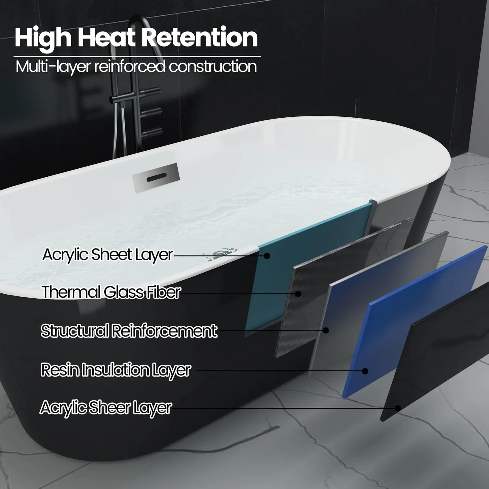 · 【High-Quality Acrylic & Timeless Design】Crafted from high-gloss, reinforced acrylic known for its durability and excellent heat retention, this bathtub is built to last. Its versatile options design effortlessly complement both modern and traditional bathroom aesthetics, serving as a stunning focal point.
