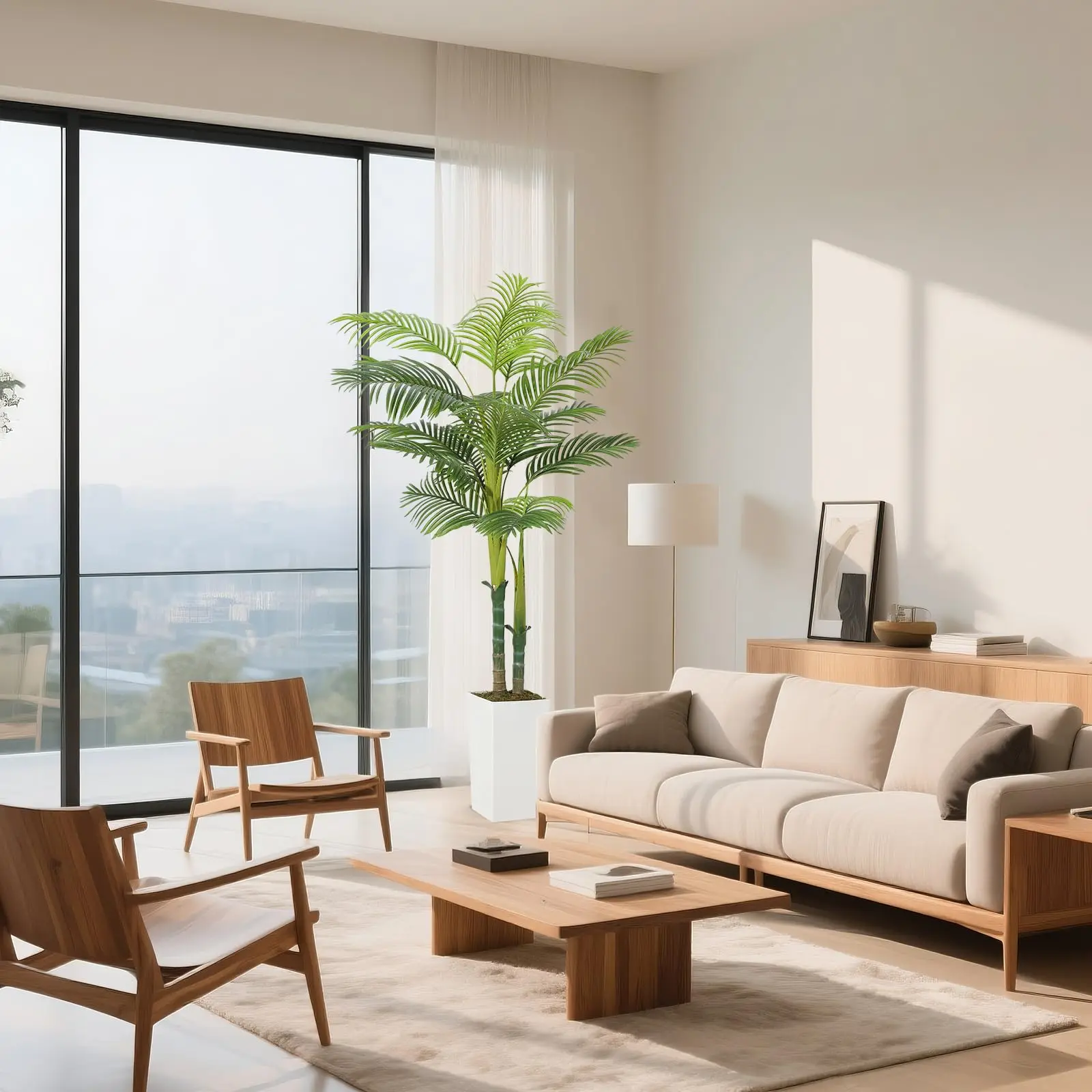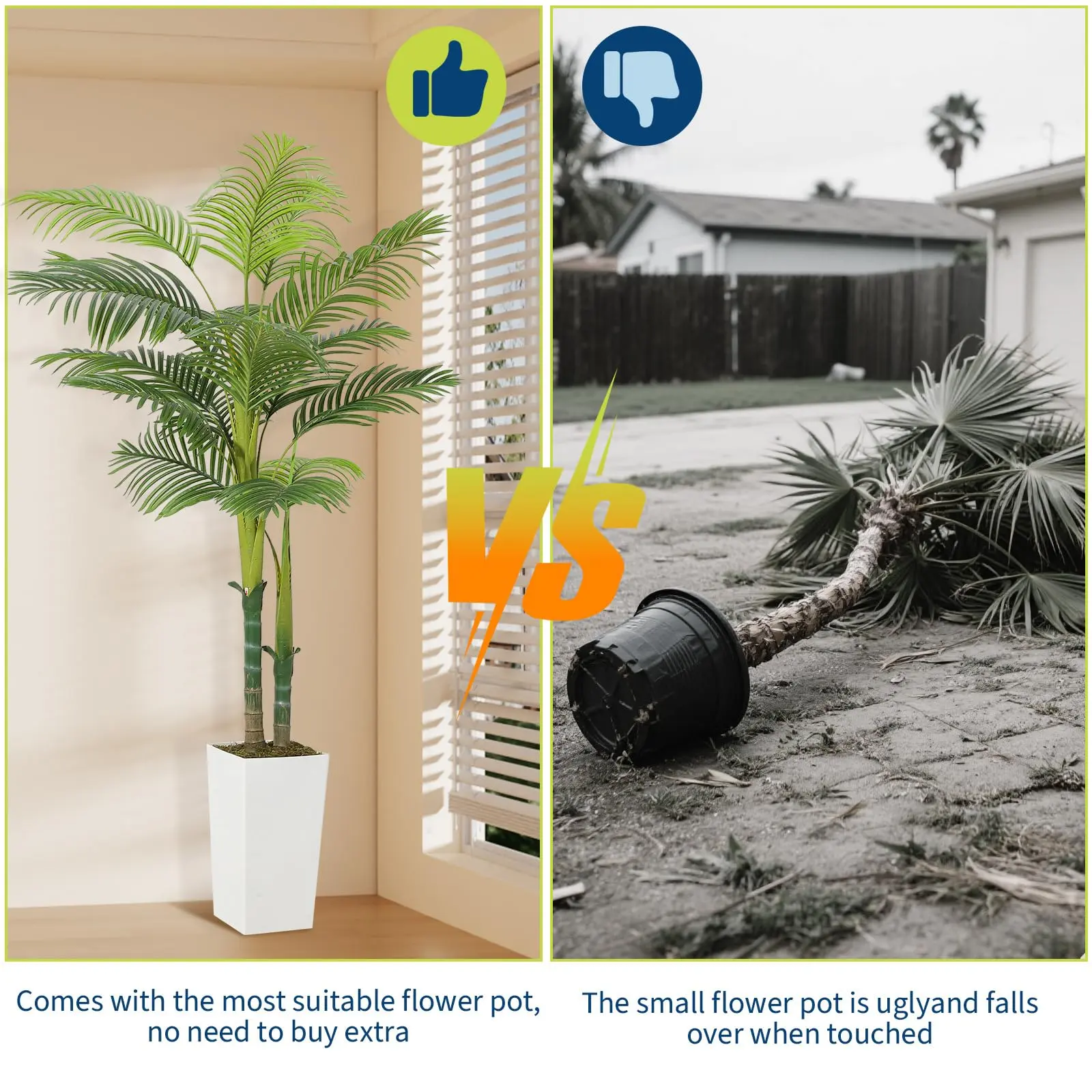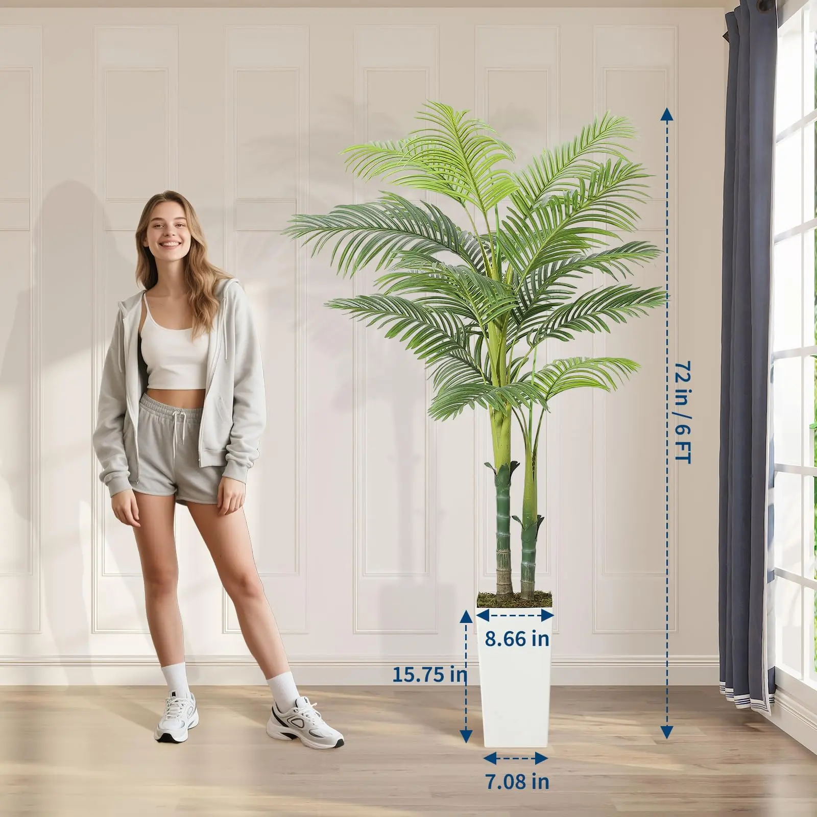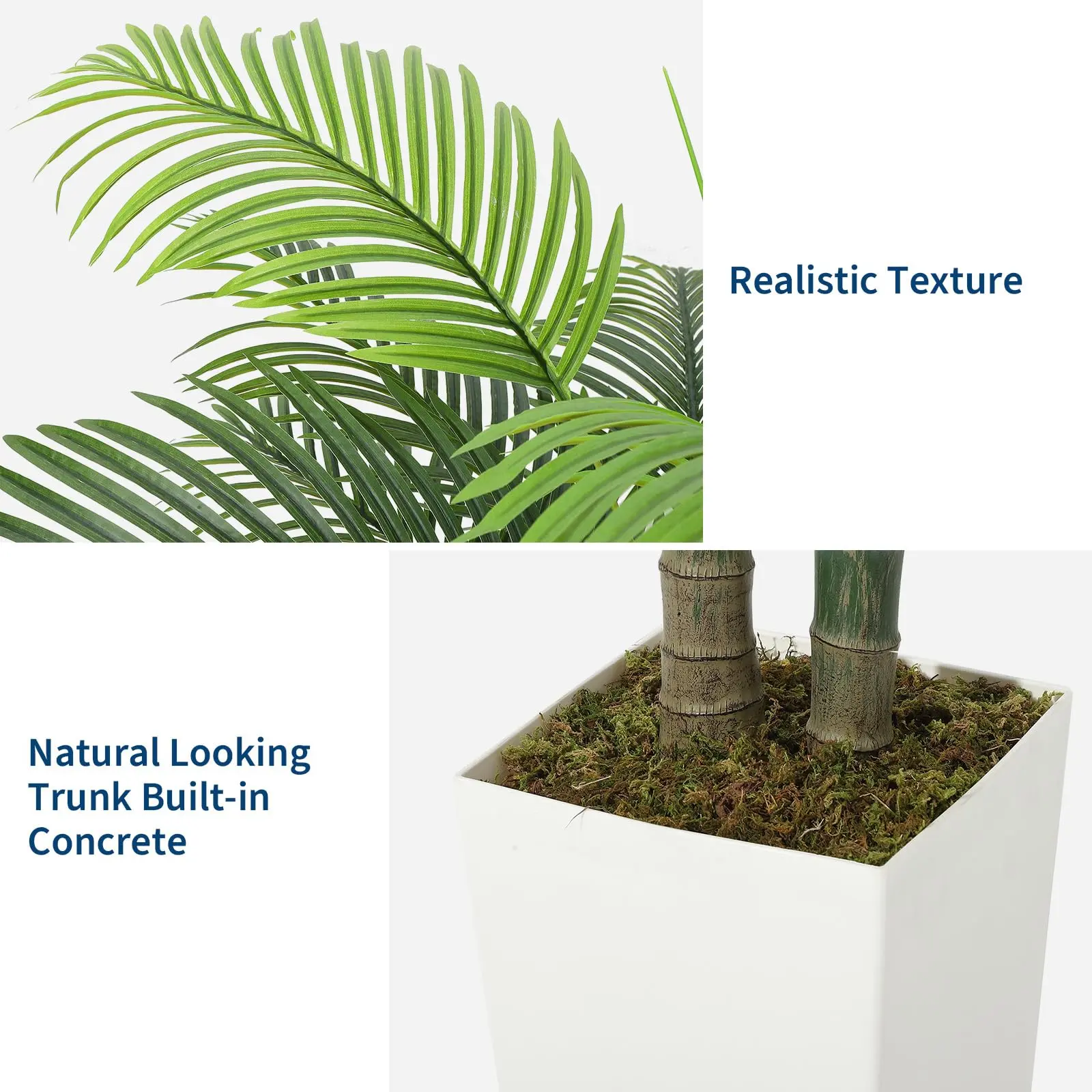 · Premium Realistic Design: Features 2 sturdy trunks with 13 arched fronds showcasing high-definition vein textures. The 15.7" white tall planter includes faux moss topping and weighted concrete base (8.7" wide) for ultimate stability - no messy soil or watering needed!
