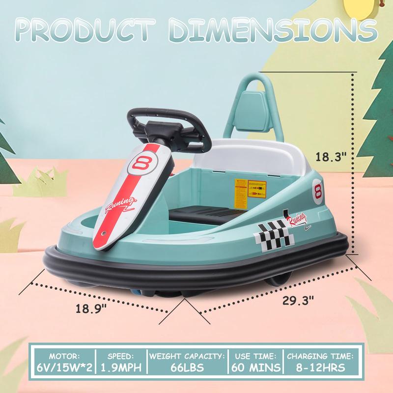· 【GIFT FOR BOYS&GIRLS】This bumper car is a perfect addition to interactive and group games. Kids can bump each other for more riding fun. Overall Dimensions: 29.3"(L) x 18.9"(W) x 18.3"(H). NOTE: Without Remote Control)