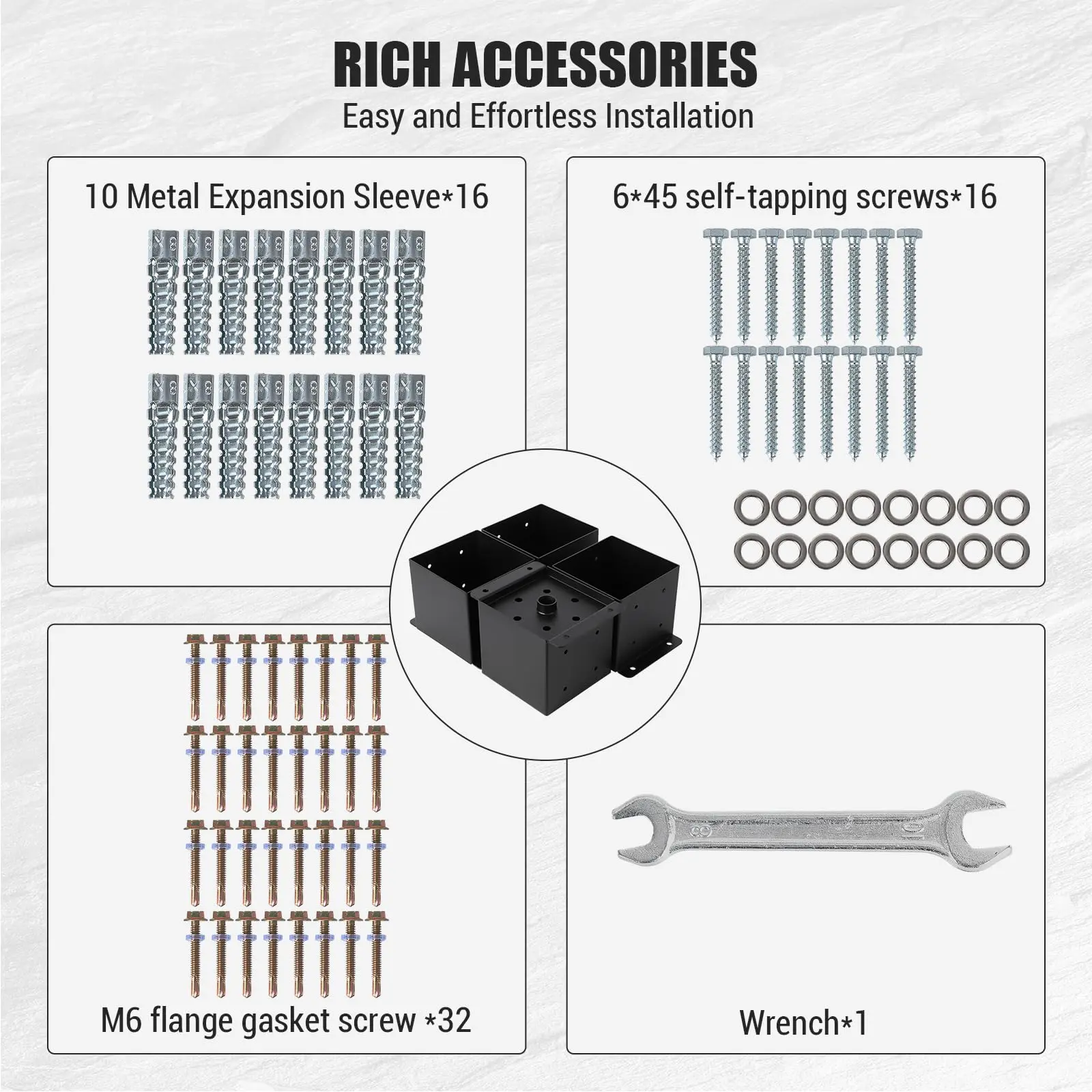 · Complete Hardware Kit Included: Each set comes with the essential bolts, anchors, and screws for quick setup on both wood and concrete surfaces. The pre-drilled holes ensure secure installation and a clean, professional finish with minimal effort.