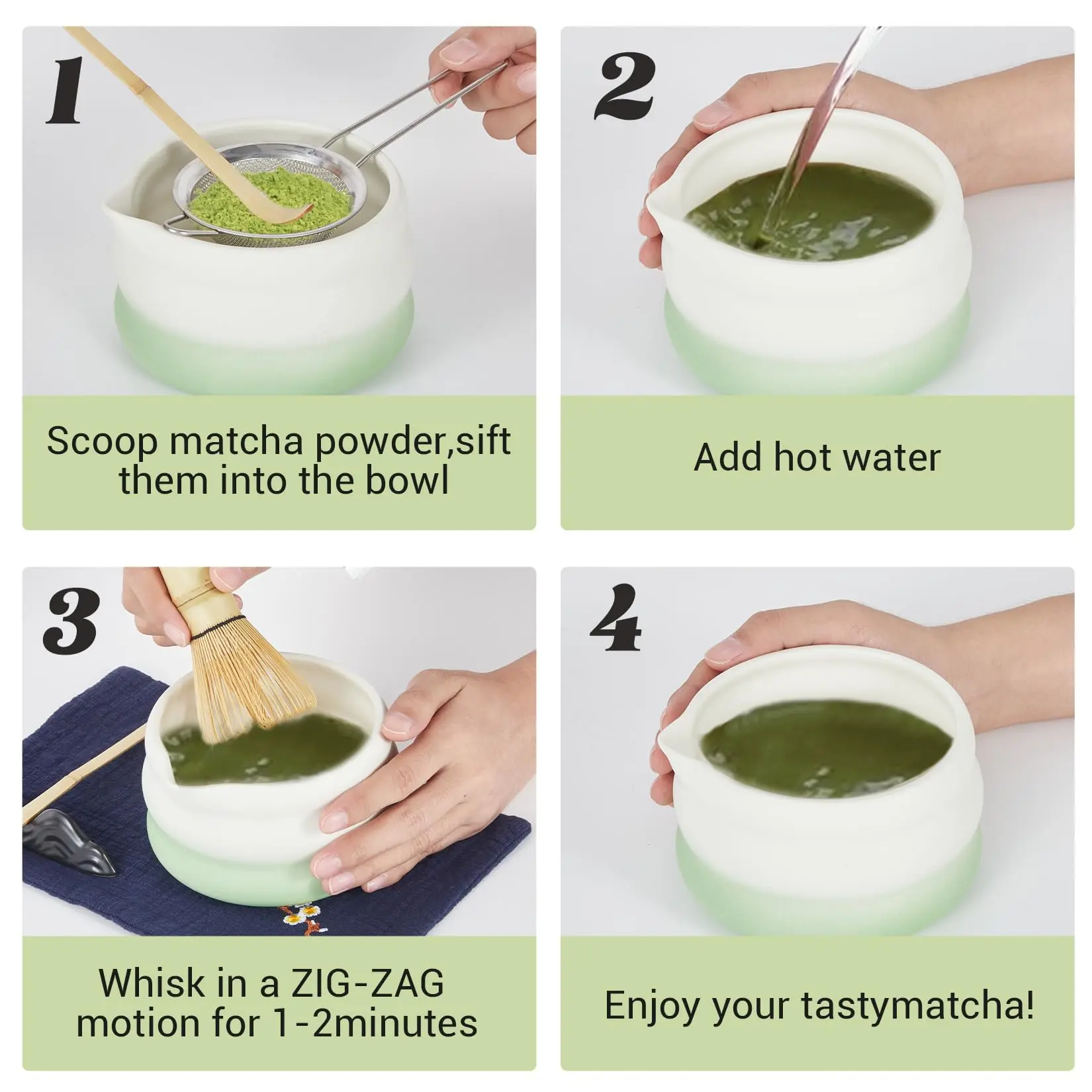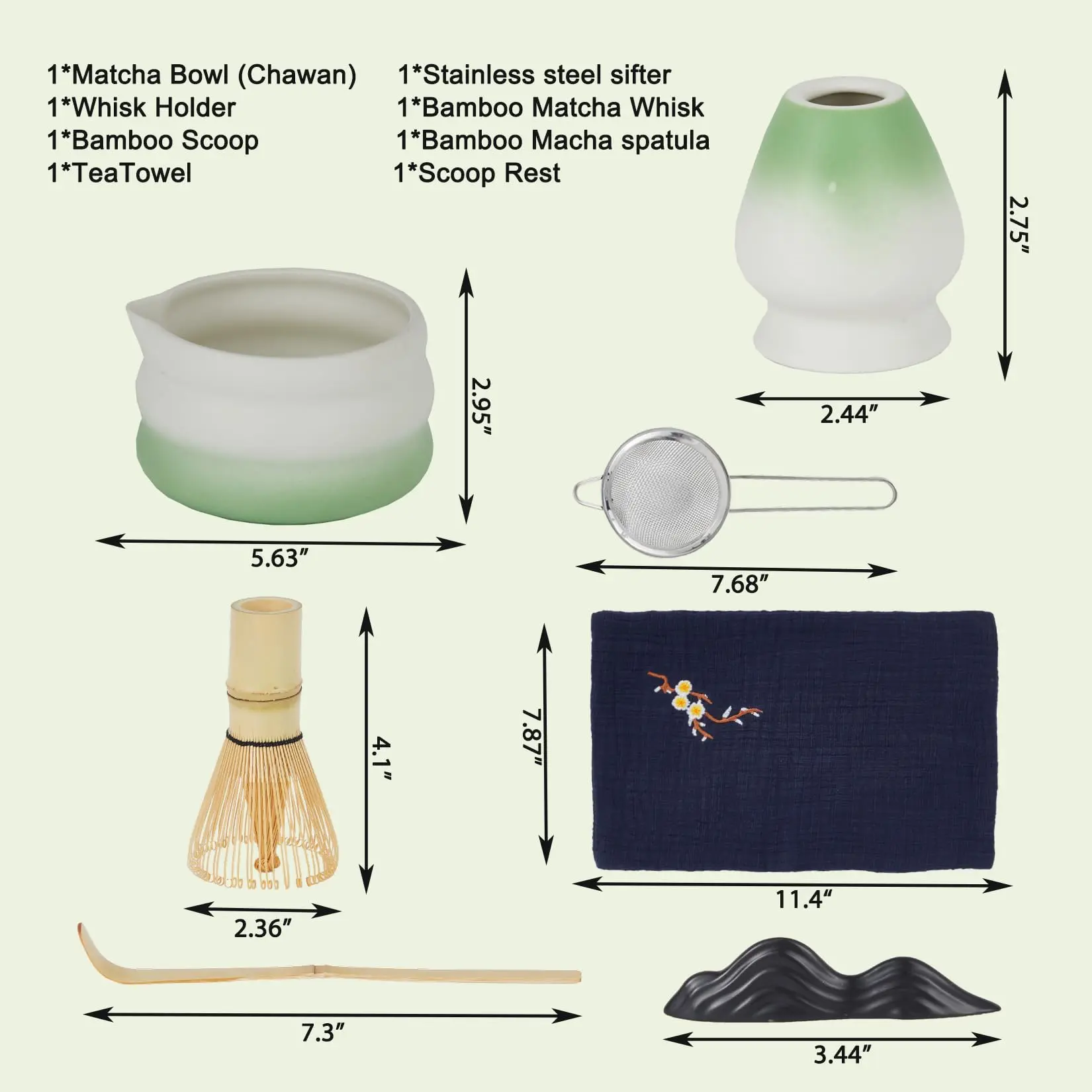 · Complete 7 Pcs Matcha Kit: This matcha whisk set includes everything you need for an authentic tea experience—ceramic matcha bowl, ceramic whisk holder, bamboo whisk, bamboo scoop, scoop rest, stainless steel sifter, and tea towel—making every matcha preparation special and effortless