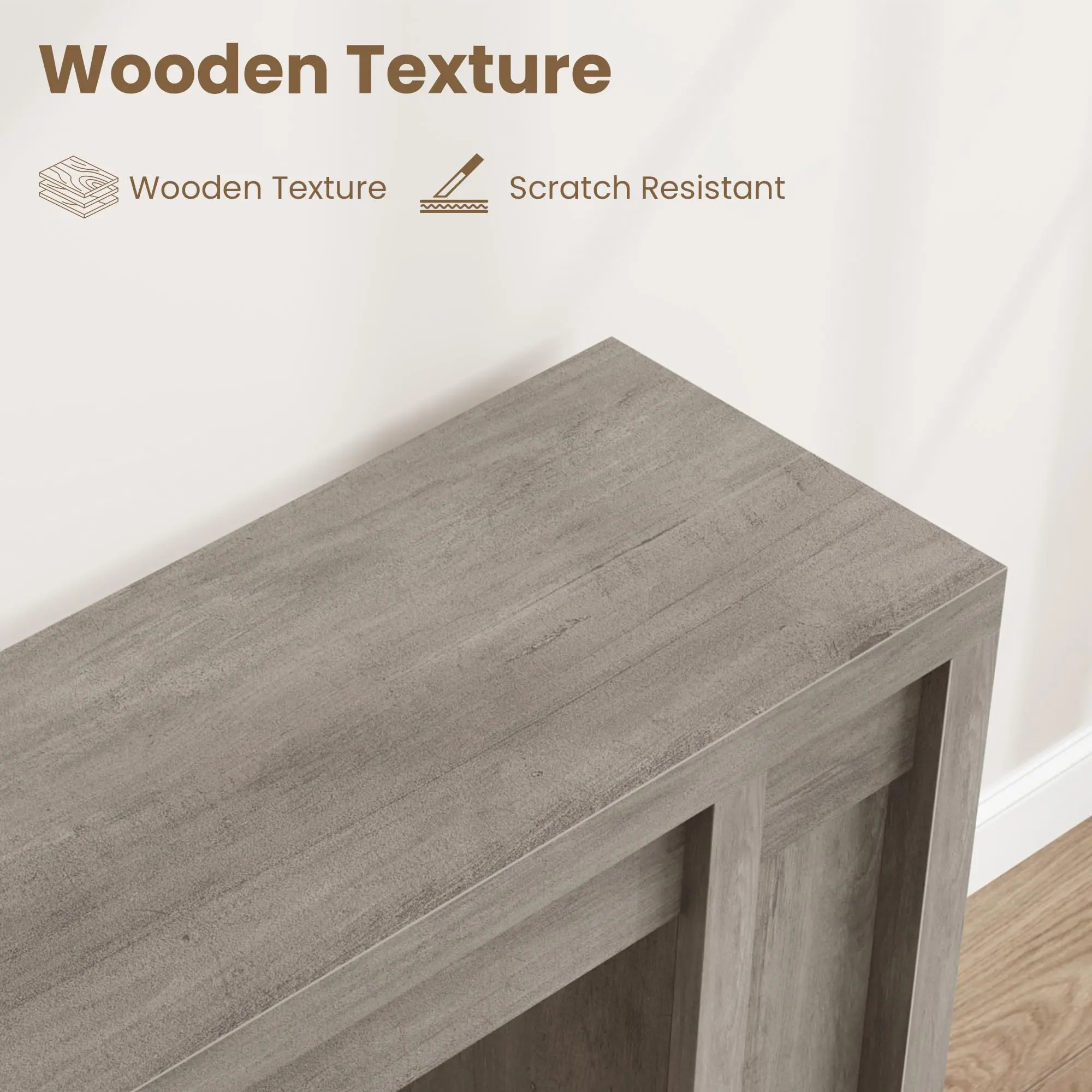 · Farmhouse Entryway Table:Crafted from MDF with a vintage wood grain finish, this entryway console table resists water and scratches. Its timeless farmhouse design seamlessly complements a variety of home décors, making it perfect for any entryway or living room.