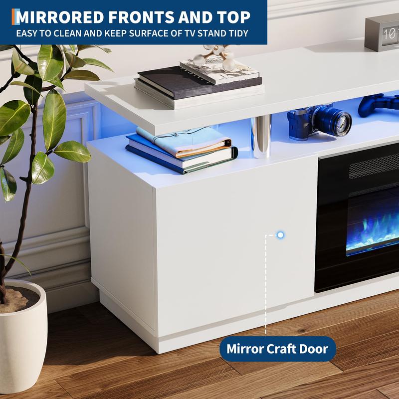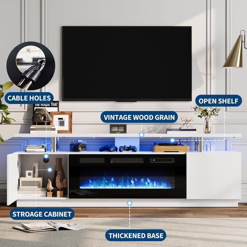 · Modern White Aesthetic: Featuring a high-gloss finish paired with a matte white frame, this fireplace TV stand delivers a modern, bright look that blends seamlessly with contemporary home décor. Compatible with TVs up to 80 inches, it serves as a polished focal point that enhances both style and practicality in your living space