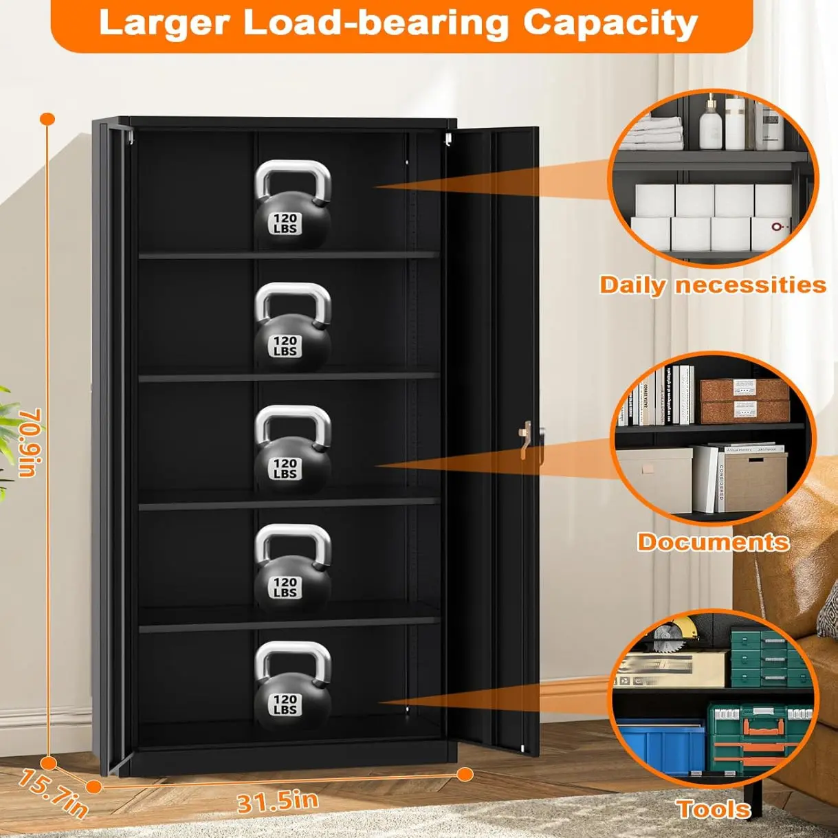 ✅ Spacious 71"H x 31.5"W x 15.8"D Storage : Fits bulky tools, seasonal items, or office supplies. Two 180° swing doors offer full access.