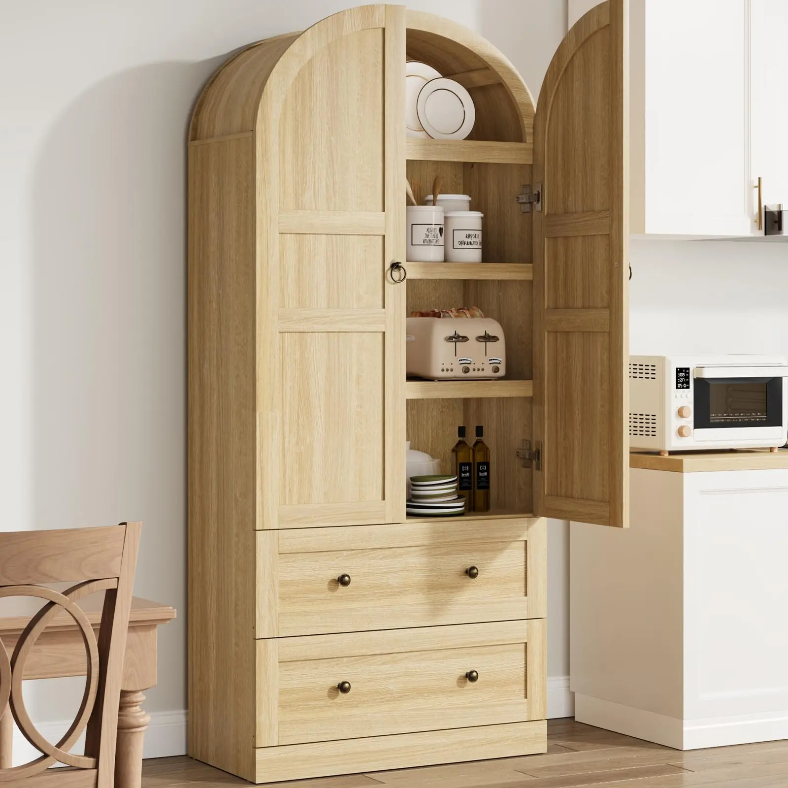 · 2. Farmhouse Arched Chic Design: This modern farmhouse-style bookcase graceful, arched silhouette that frames sophisticated wood-front doors, while integrated storage solutions offer practical everyday access. This versatile piece masterfully merges timeless elegance and functional design – a statement organizer that turns clutter into curated style.