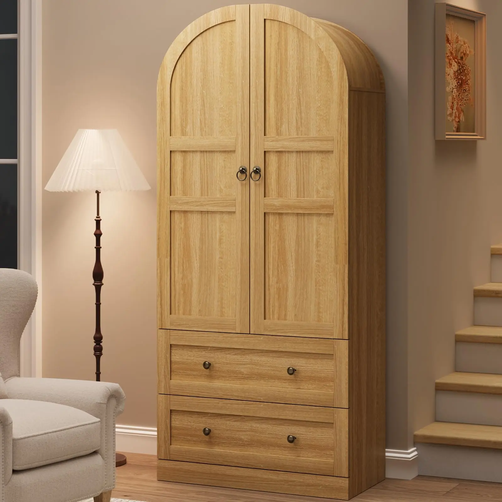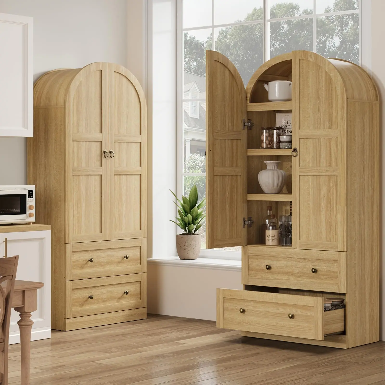 · 2. Farmhouse Arched Chic Design: This modern farmhouse-style bookcase graceful, arched silhouette that frames sophisticated wood-front doors, while integrated storage solutions offer practical everyday access. This versatile piece masterfully merges timeless elegance and functional design – a statement organizer that turns clutter into curated style.