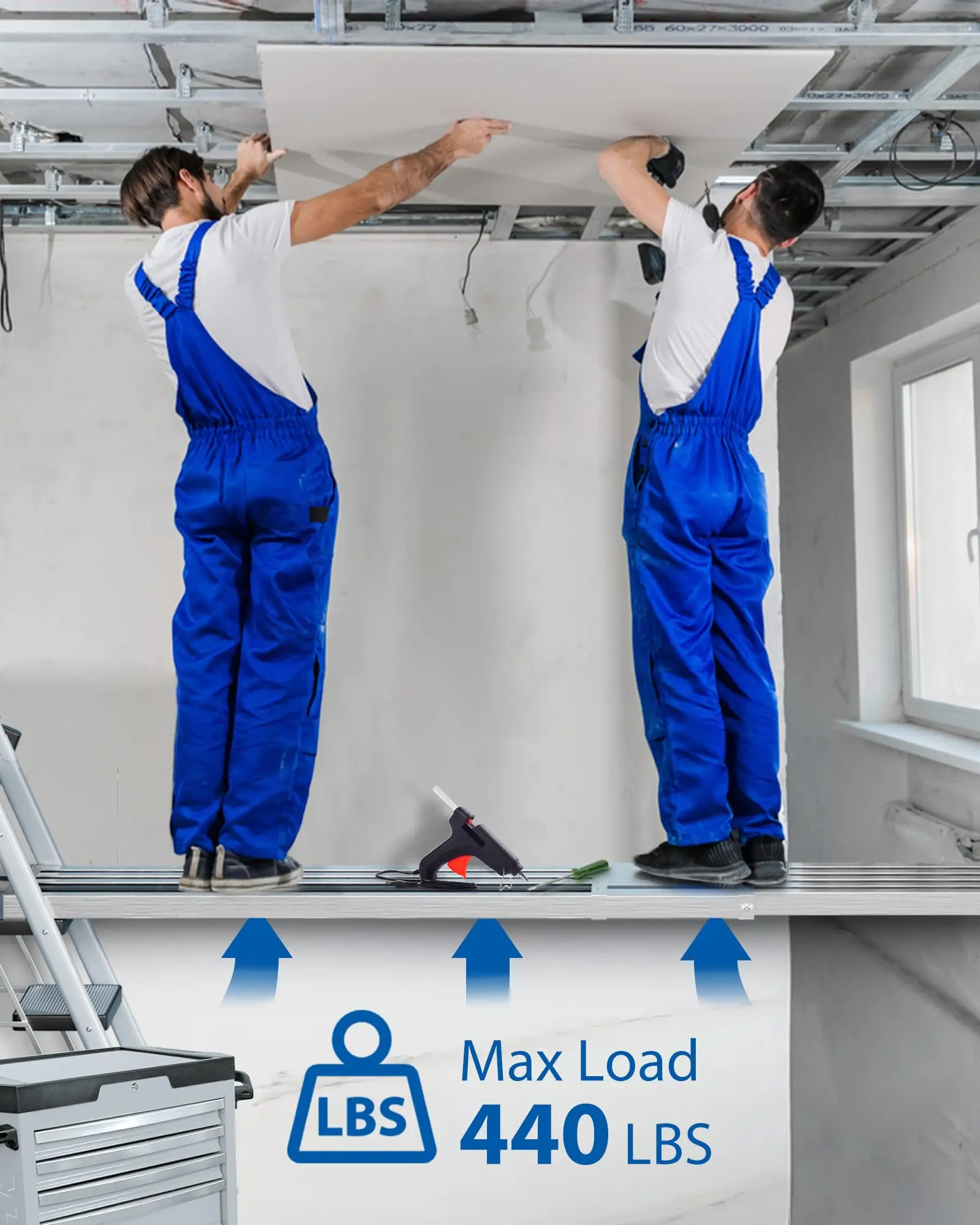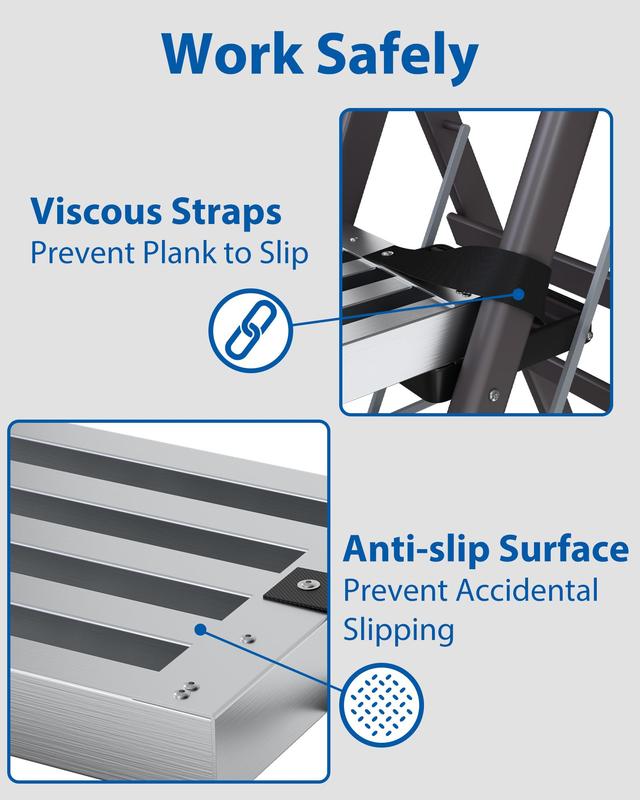 · 440 Lbs Weighing Capacity: The high-strength aluminum structure can support up to 440 pounds, allowing one or two people to stand on the board and work. The telescopic plate is easy to use in combination with scaffolding or ladders.