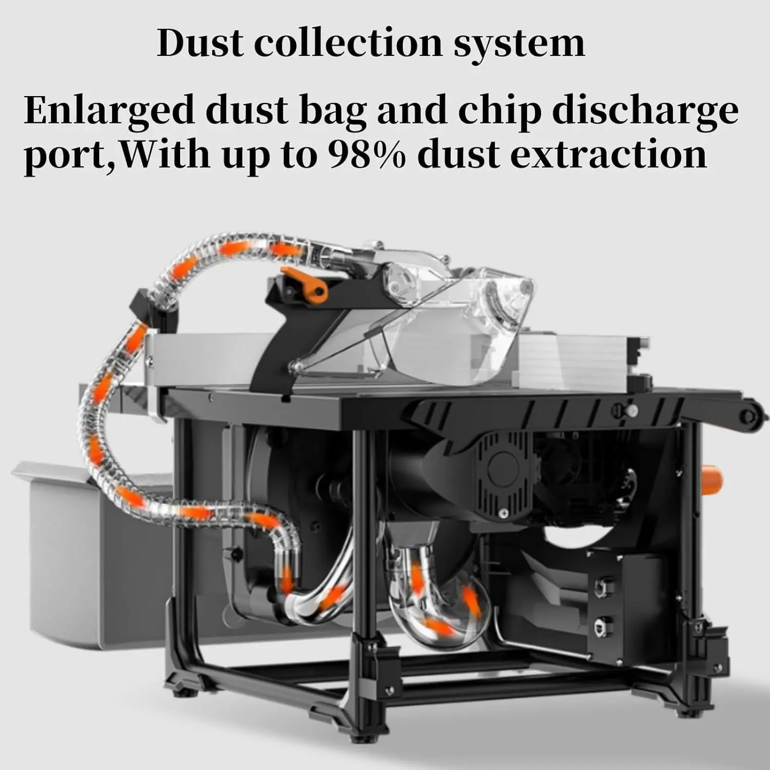 · Easy to clean and convenient to store: The back of the table saw is designed with a port for connecting a dust collector to redirect dust to the container for easy cleaning. This table saw has a dust absorption rate of up to 98%, which can effectively reduce dust and debris during operation, creating a cleaner and healthier working environment. In addition, it also has onboard storage space for guards, fences, wrenches and miter gauges for portability and convenience.