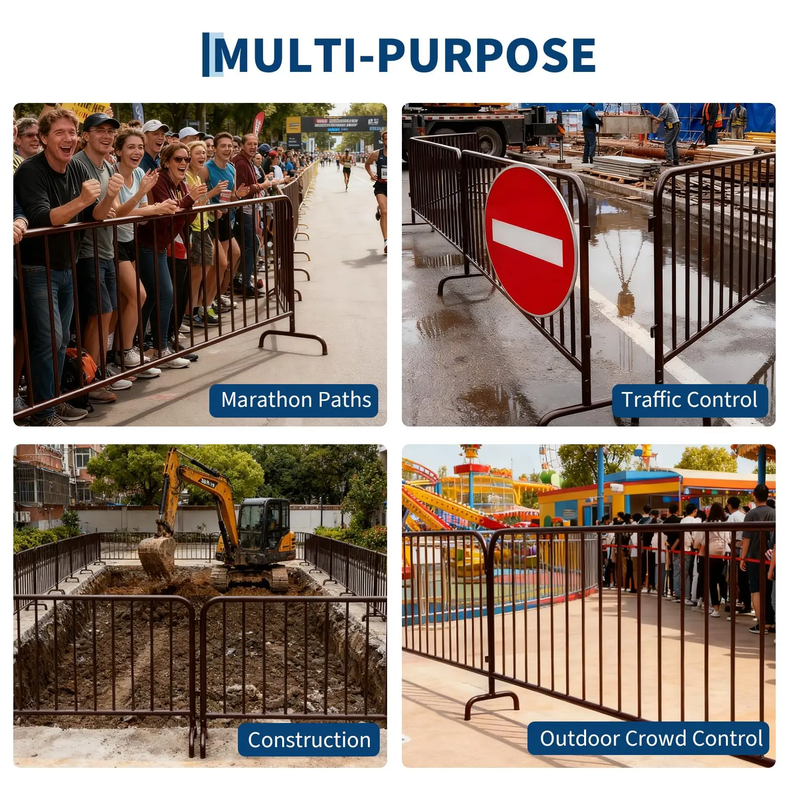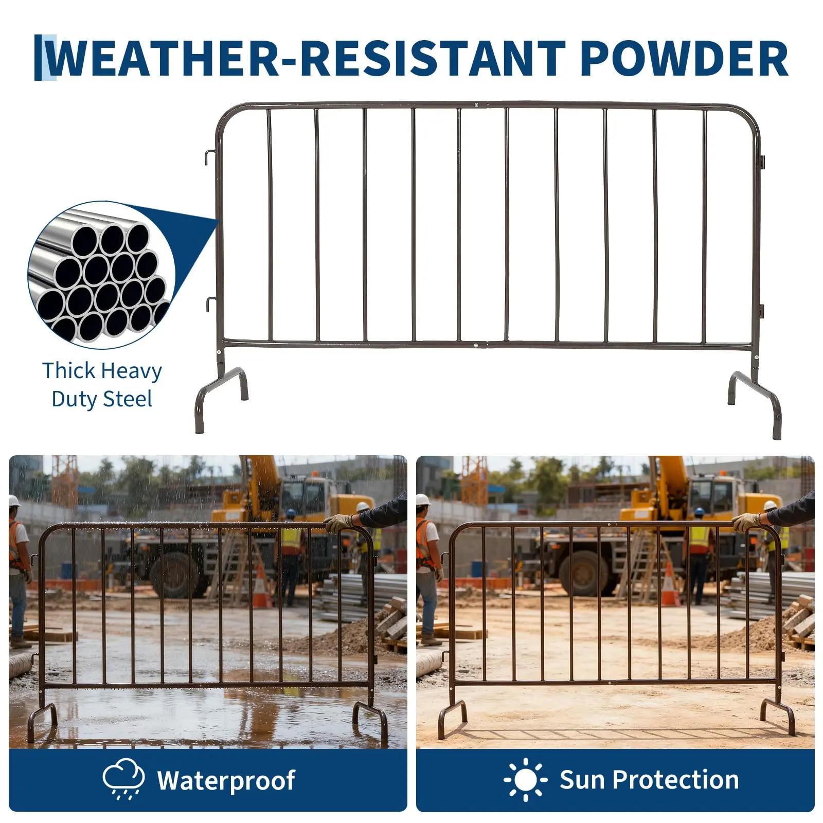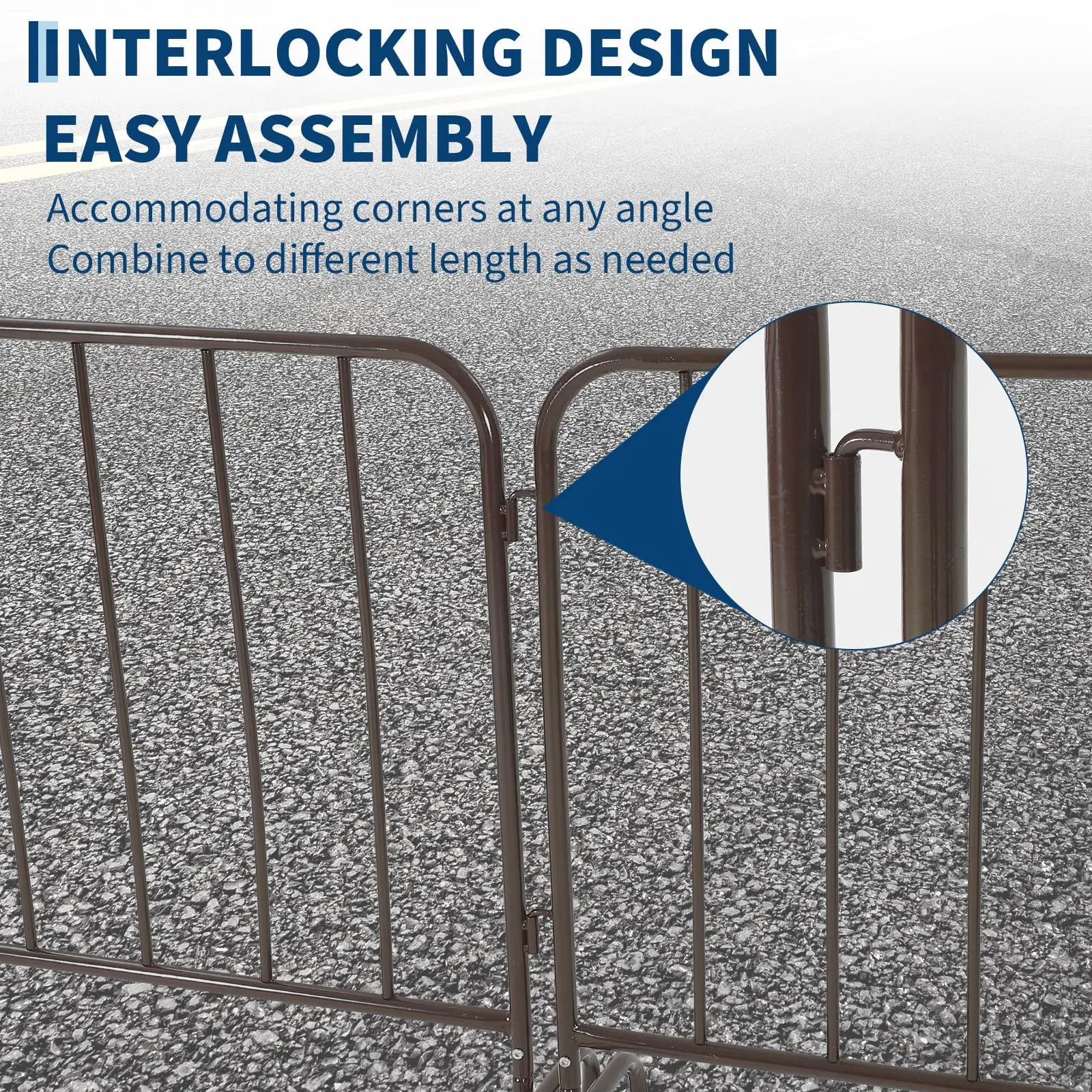 · Modular Interlocking Crowd Control SystemEach steel barricade features an interlocking design that allows multiple units to connect securely in straight runs or angled formations. Easily customize your crowd control barrier system on-site to fit different perimeters, pathways, and restricted zones.