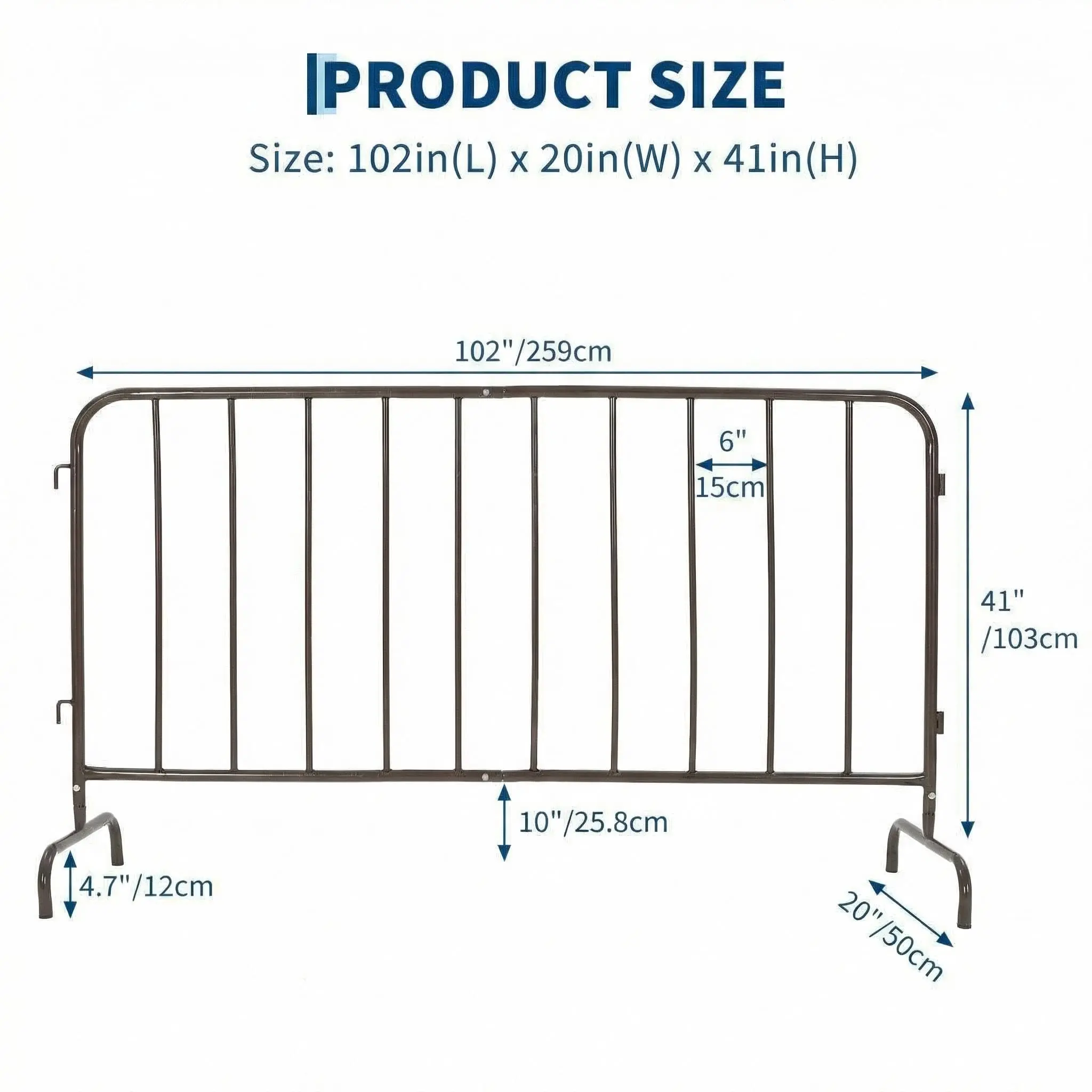 · Multiple Size Options for Any Site LayoutAvailable in multiple lengths from 5FT to 8.5FT to meet diverse crowd control needs. All models share a uniform 41-inch height and 20-inch base width, creating a consistent, professional appearance when interconnected at events or construction sites.