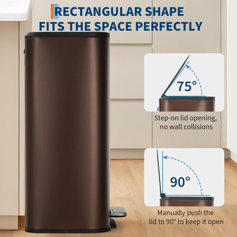 · Convenient Foot Pedal: We understand the importance of convenience and hygiene. That's why our garbage can is equipped with a user-friendly foot pedal at the bottom. With a simple light step, you can easily open the lid, eliminating the need to bend down or touch the can.