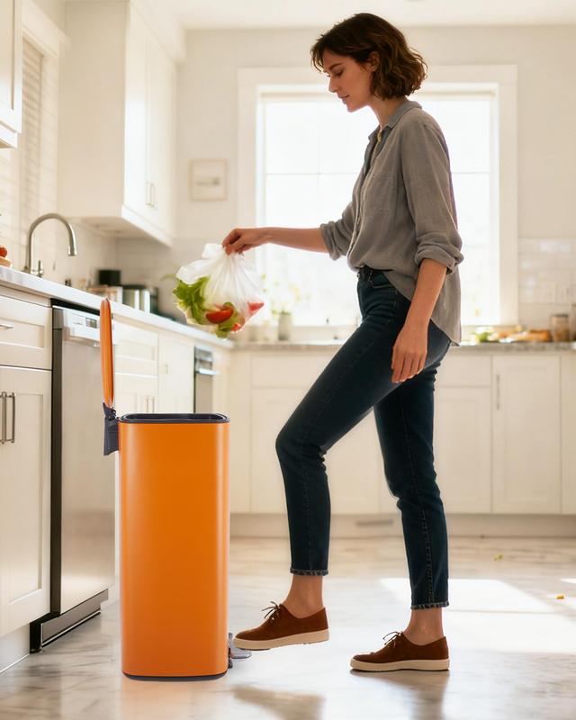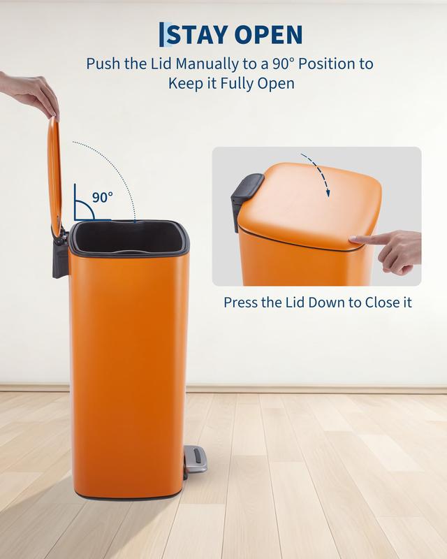 · Hands-Free Hygiene & Dual Opening Modes: Step on the robust foot pedal for touch-free disposal, or manually lift the lid beyond 90° to lock it open during tasks. This versatile operation prioritizes cleanliness and everyday convenience.