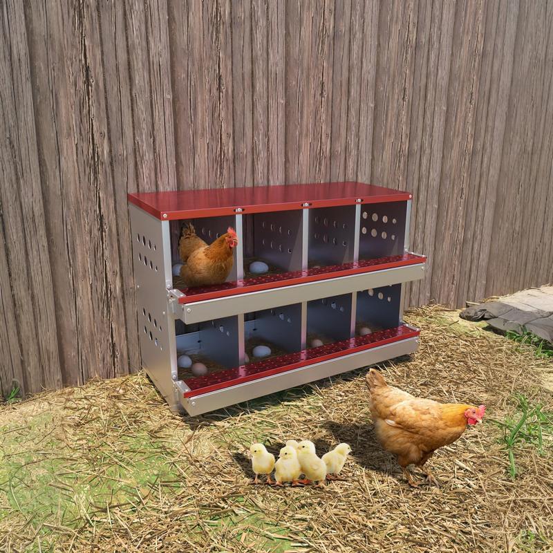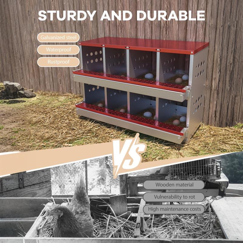 · Comfortable & Spacious Nesting - Chicken nesting box boosts egg production with eight roomy compartments (9.84"D × 9.06"W × 8.46"H each), designed for optimal comfort. Includes plastic guide eggs to encourage hens to lay, a built-in perch for heat regulation, and easy wall-mounting holes (18–20 inches above floor).