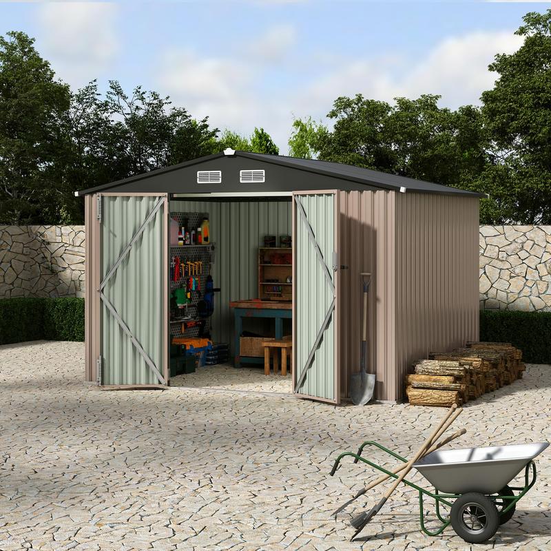 · SPACIOUS STORAGE SPACE - The 8×10 FT outdoor storage shed measures 116.54 inches in length, 88.98 inches in width, and 77.17 inches in height. The metal storage sheds is designed to meet all your outdoor storage needs. This durable metal garden shed provides ample space for storing lawn mowers, ladders, tool kits, and other items, helping to keep your yard tidy. Additionally, you can enhance its functionality by purchasing storage racks that can be easily mounted on the shed walls