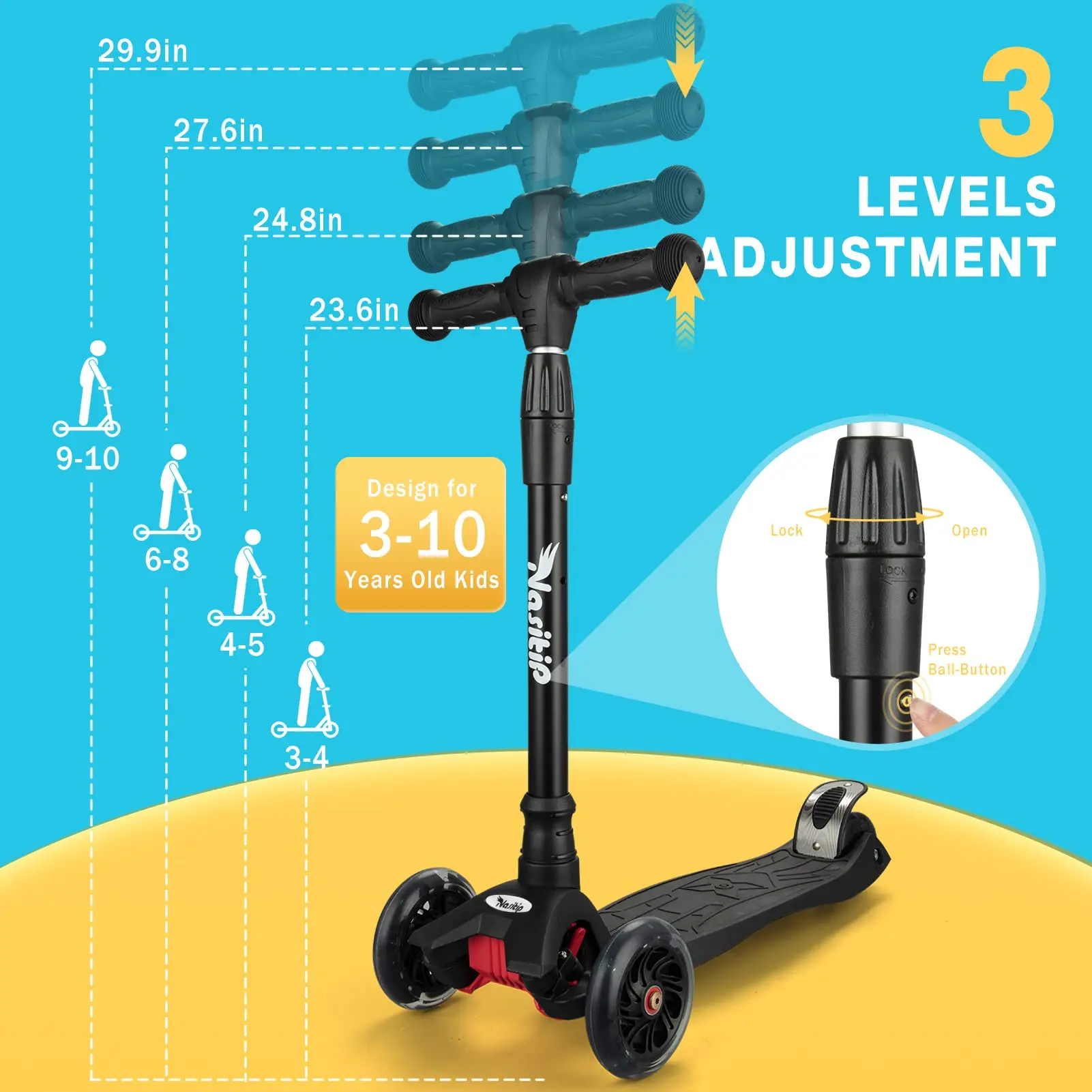 Brand : GARVEE Color : Deep-Black Age Range (Description) : Little Kid Special Feature : Adjustable Handlebar Height, Light Up Wheels, Lights, Lockable, Non Slip Deck Weight Limit : 50 Pounds Number of Wheels : 3 Model Name : PTO_0X5FYLK8-Bk-4 Wheel Material : Polyurethane Frame Material : Aluminum Item Weight : 7 Pounds Handlebar Type : Adjustable Handle Height : 33 Inches Wheel Size : 4.7 Inches Wheel Type : 120mm flashing Wheels Suspension Type : Rigid Grip Type : Anti-slip Brake Style : Rear Braking Warranty Type : Limited UPC : 196336219091 Item Package Dimensions L x W x H : 23.23 x 11.02 x 6.69 inches Package Weight : 7 Pounds Item Dimensions LxWxH : 14 x 26 x 76 inches Brand Name : GARVEE Warranty Description : 18 Months Material : Stainless Steel Suggested Users : baby-boys Part Number : PTO_0X5FYLK8-Bk-4 Included Components : 3 Wheel Kick Scooter for Kids