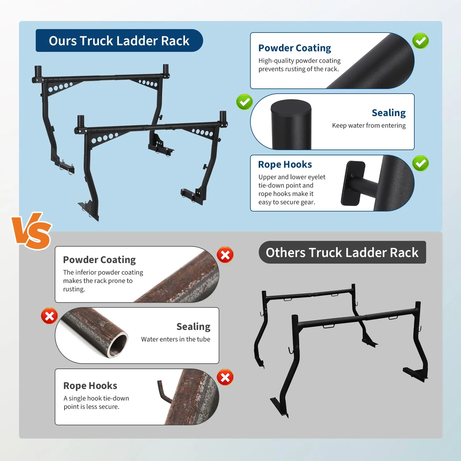 · 【Maximize Cargo Space & Tie-Down Options】 With 10 integrated tie-down holes and 5 rope hooks per side, this cargo rack for truck gives you flexible storage for ladders, rooftop cargo, surfboards, and more—freeing up truck bed space for tools, gear, or equipment.