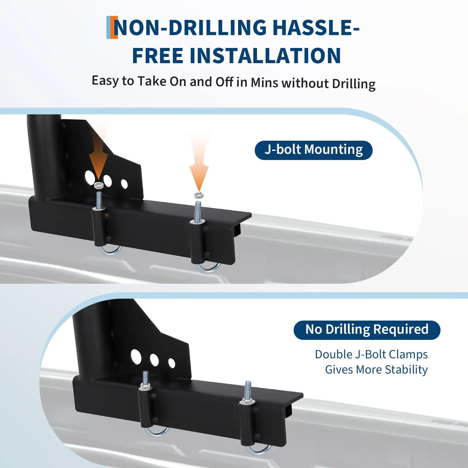 · 【Quick No-Drill Installation with J-Bolts】 The included 8 J-bolts provide fast, secure mounting for this no-drill truck rack—no need to drill into your bed rails. Protect your pickup and still carry the gear you need. Easily removable when not in use, this adjustable pickup rack works for both work and play.