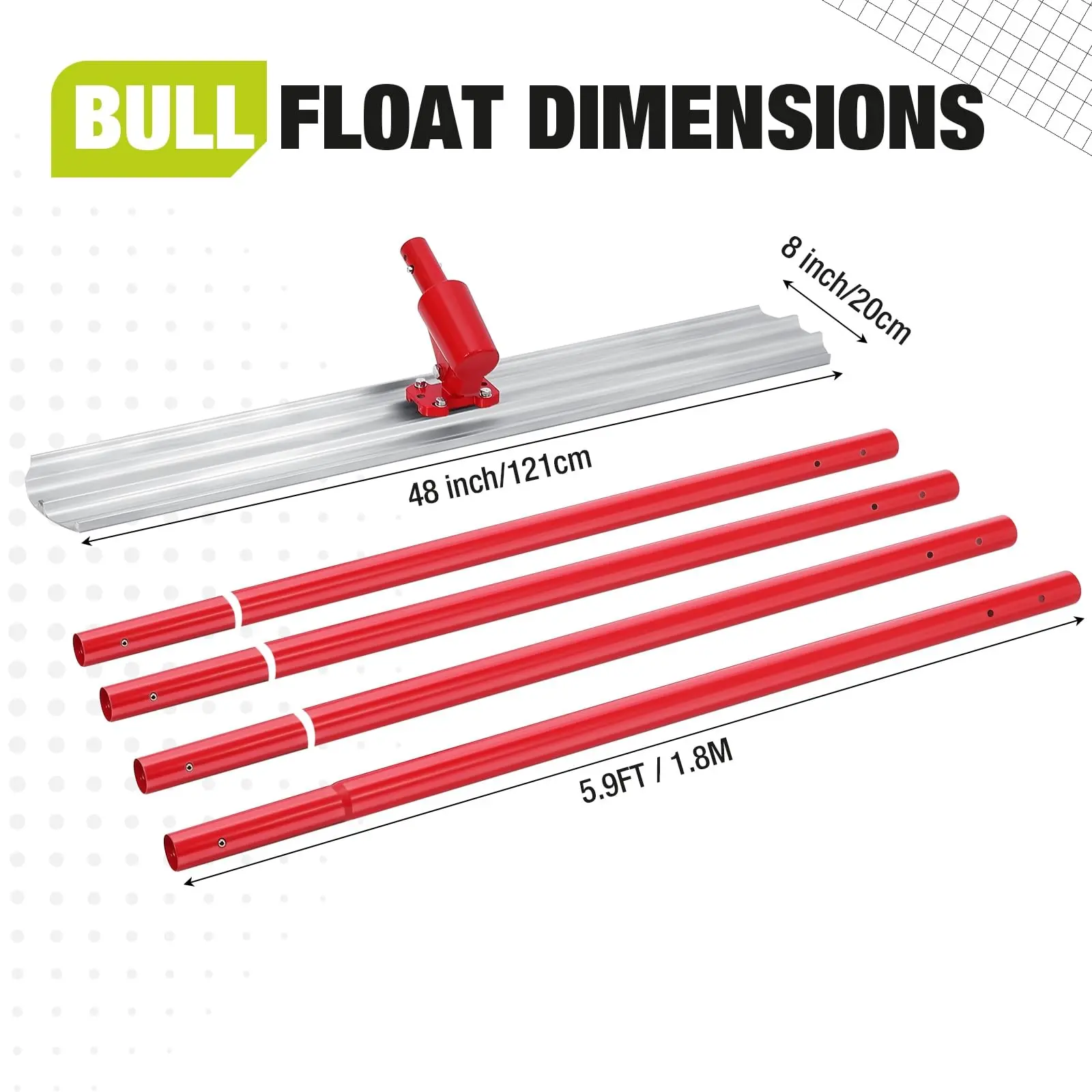 · ALUMINUM MAGNESIUM BULL FLOAT SET:The aluminum-magnesium Bull Float Set includes everything you need for concrete finishing: a magnesium float blade, a float bracket, and 4*47-inch Swaged Button Handles. The combination of these tools ensures smooth and efficient concrete leveling, even on large surfaces.