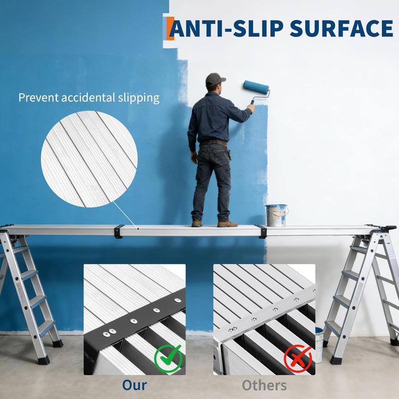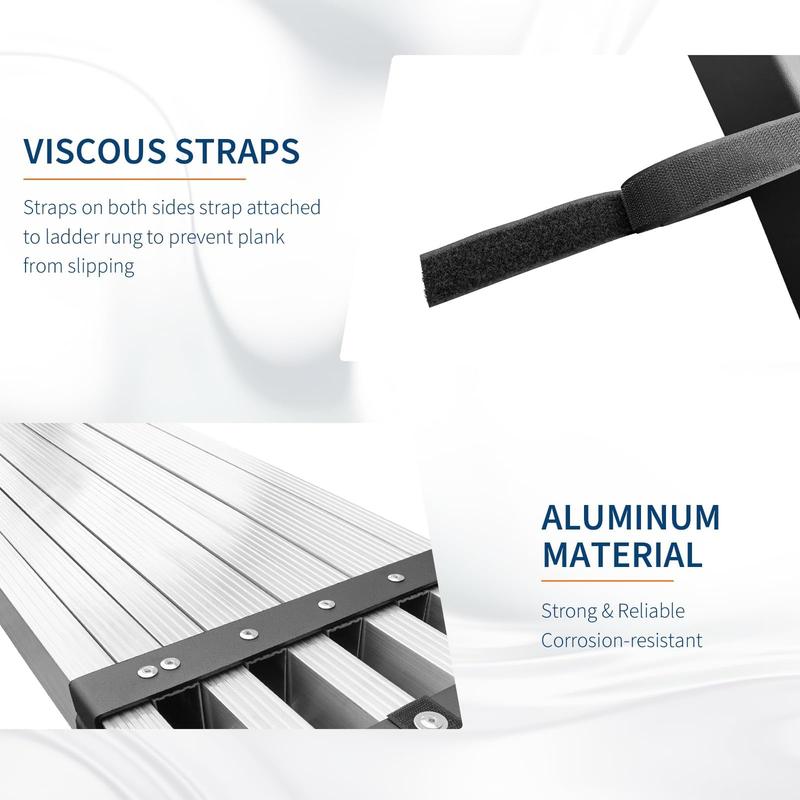 · Enhanced Safety with Non-Slip Design: The portable scaffold plank features a specially treated non-slip aluminum scaffolding plank surface and sticky straps at both ends, ensuring secure footing and reliable grip to help prevent slips or accidents